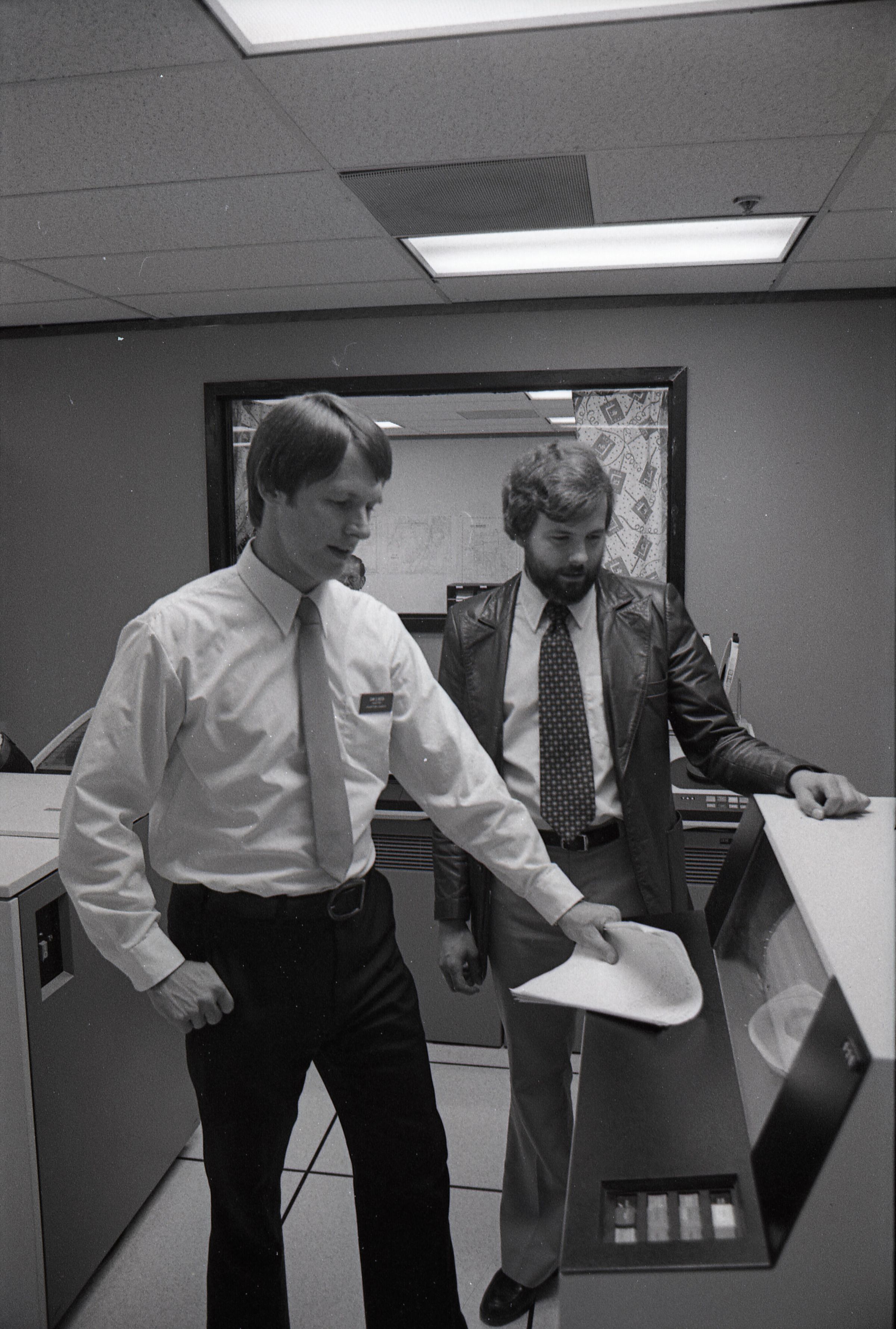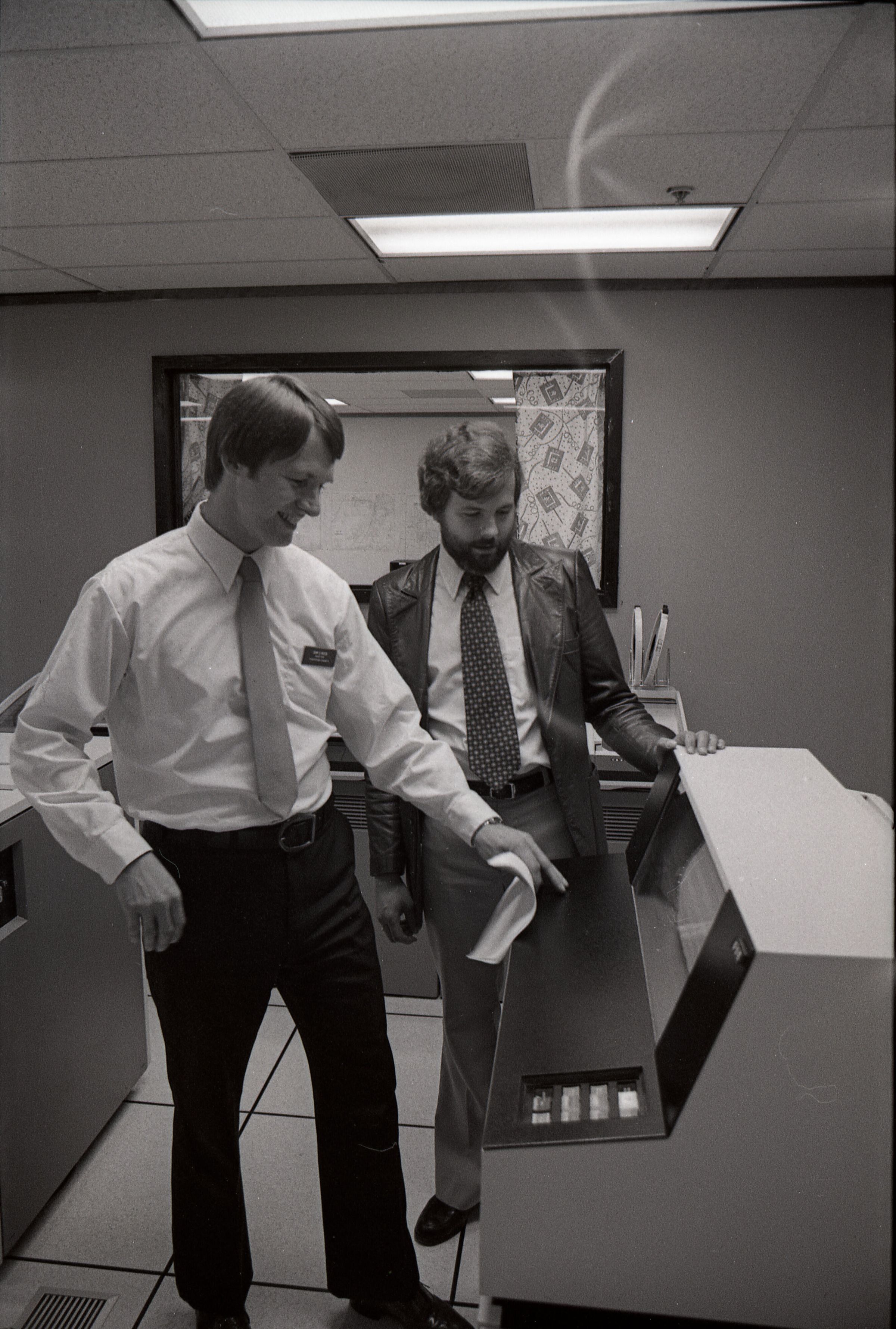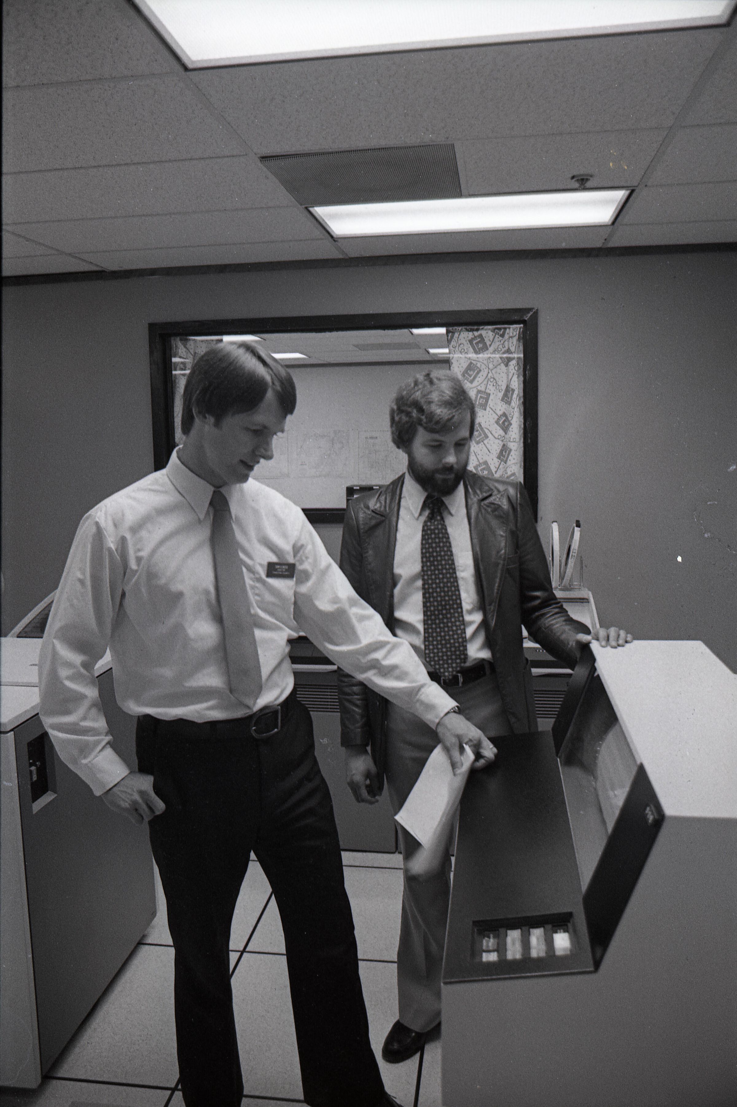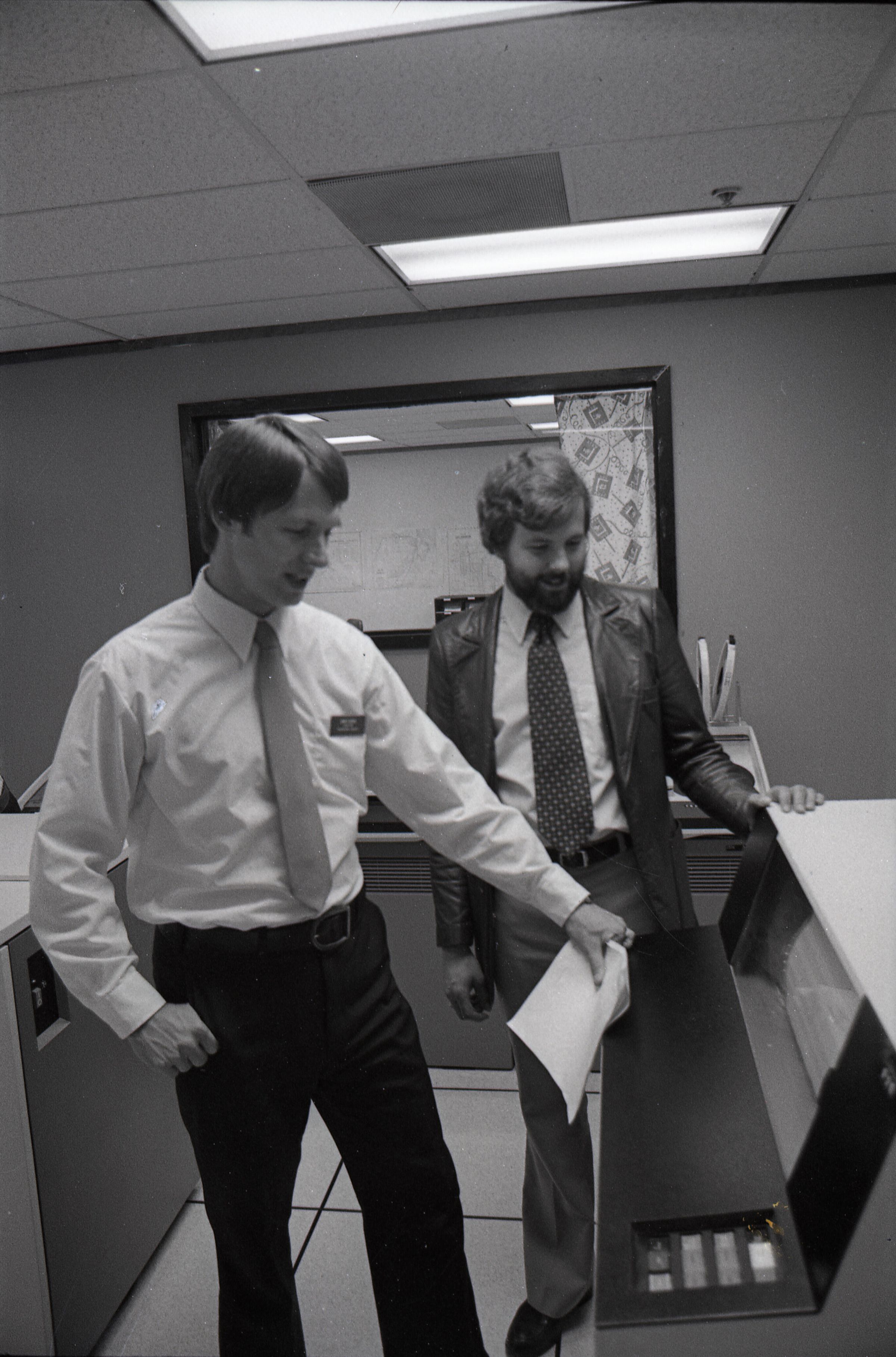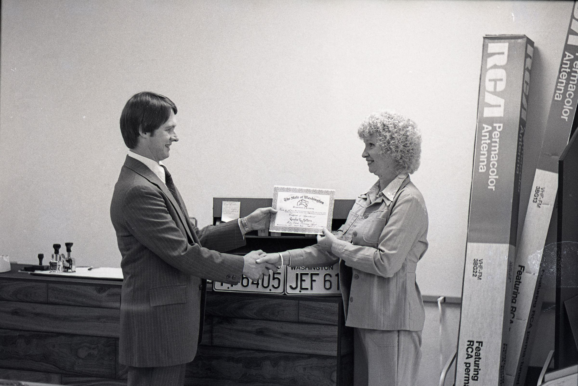 These 2 negative strips were made for the Lacey Leader Newspaper. Featured in these photos are 2 scenes. One is a set of photos of a woman handing a business certificate to a young man (Sam Reed) for a license renewal agency at McKinney Appliance 6723 Martin Way. The other set of photos features Sam Reed and a man described as Garry, standing in front of a large desk, containing a built in monitor. Frames 15, 16, 17, and 18 are all nearly identical photos of Sam Reed in the bottom left of the frame and a man named Greg behind him on the right. Frame 18 is different from the rest because Sam Reed is smiling. Sam is holding a booklet of papers in his left hand and gesturing with the same hand toward the monitor in front of him. Sam is wearing a nametag on a long sleeve button up shirt and dark slacks. To his right Garry is looking downward toward the monitor in front of him. His left hand is on the desk. He has a beard and is wearing a jacket over a button up shit, with a polka dot bowtie. It appears that he may be wearing bell bottom pants. Frame 17 and 18 Sam Reed (left) and Ronalee Mattern (right) are standing in front of a wooden desk and both holding a certificate of appointment from the Washington State Department of Licensing for Ronalee K Mattern (not Matten as is written on in the title). The pair are both facing slightly inward toward each other and looking in the direction of the camera. There are two Washington State license plates below the certificate that the pair is holding the first license plate (left) reads "TT6405" and the second reads "JEF615". To the left of the two people are several stamps and to the right are boxes of RCA antennas. Frames 19, 20, and 21 are identical photos that are very similar to frames 17 and 18, except that the pair are shaking hands while looking at each other, instead of the camera.