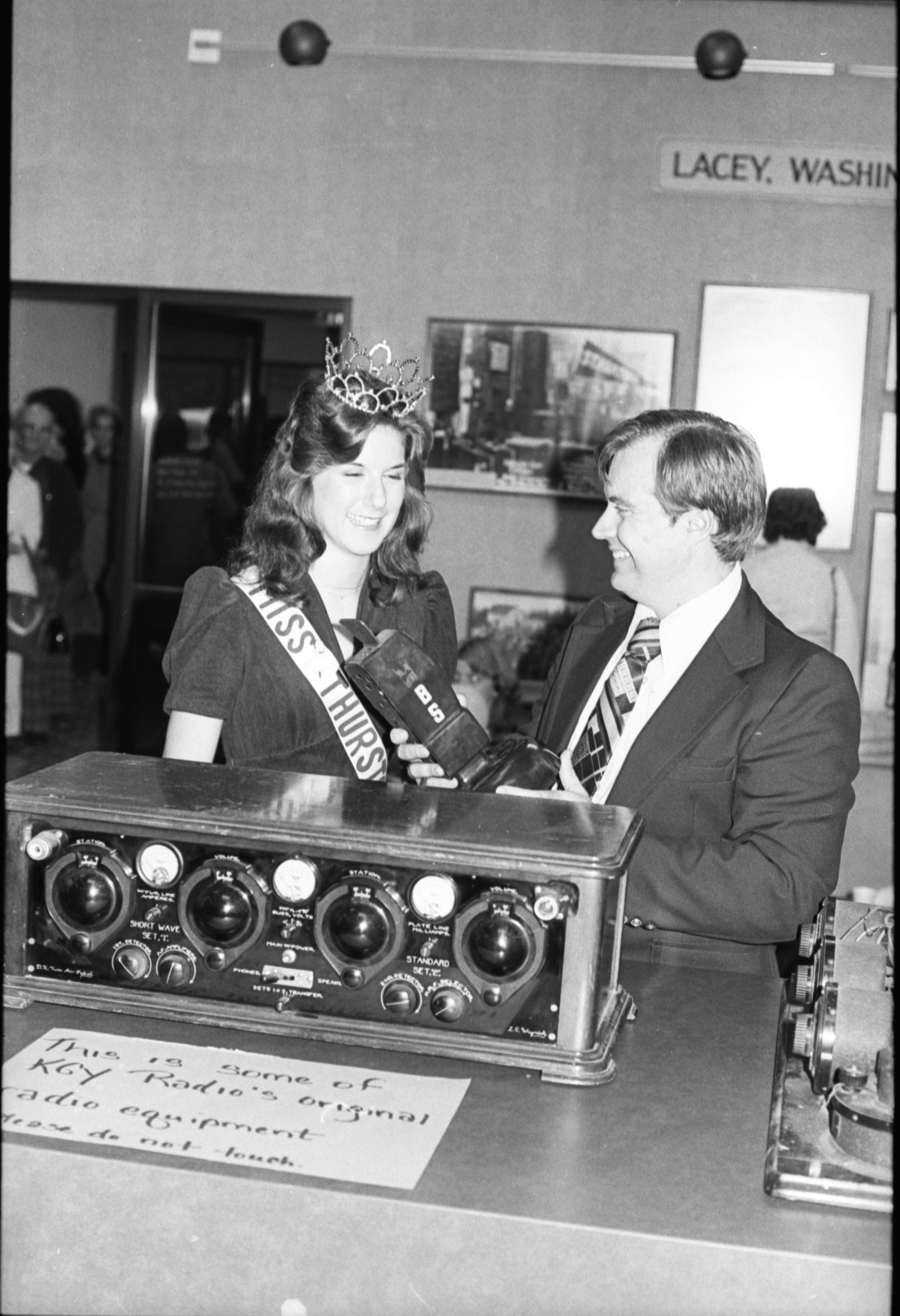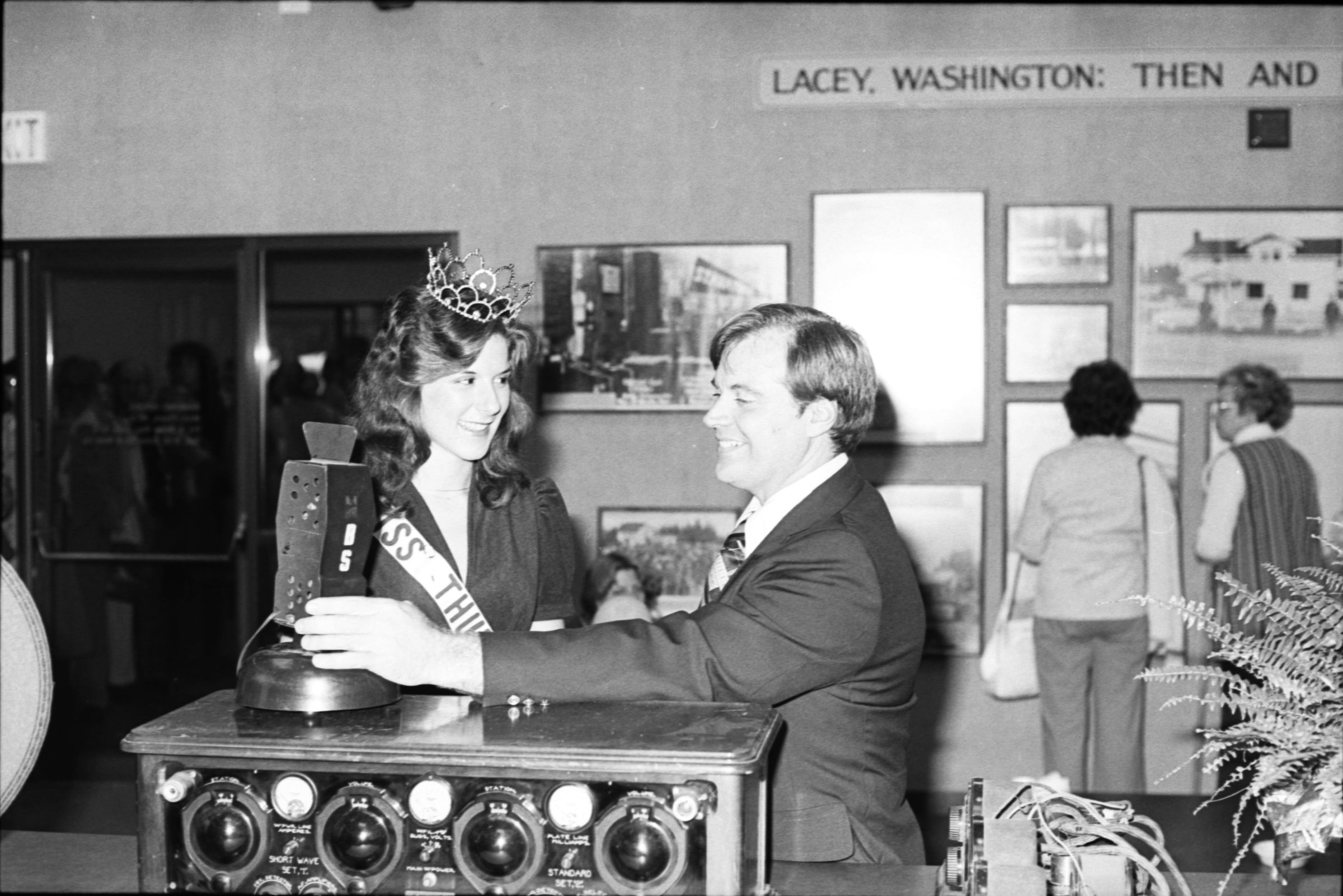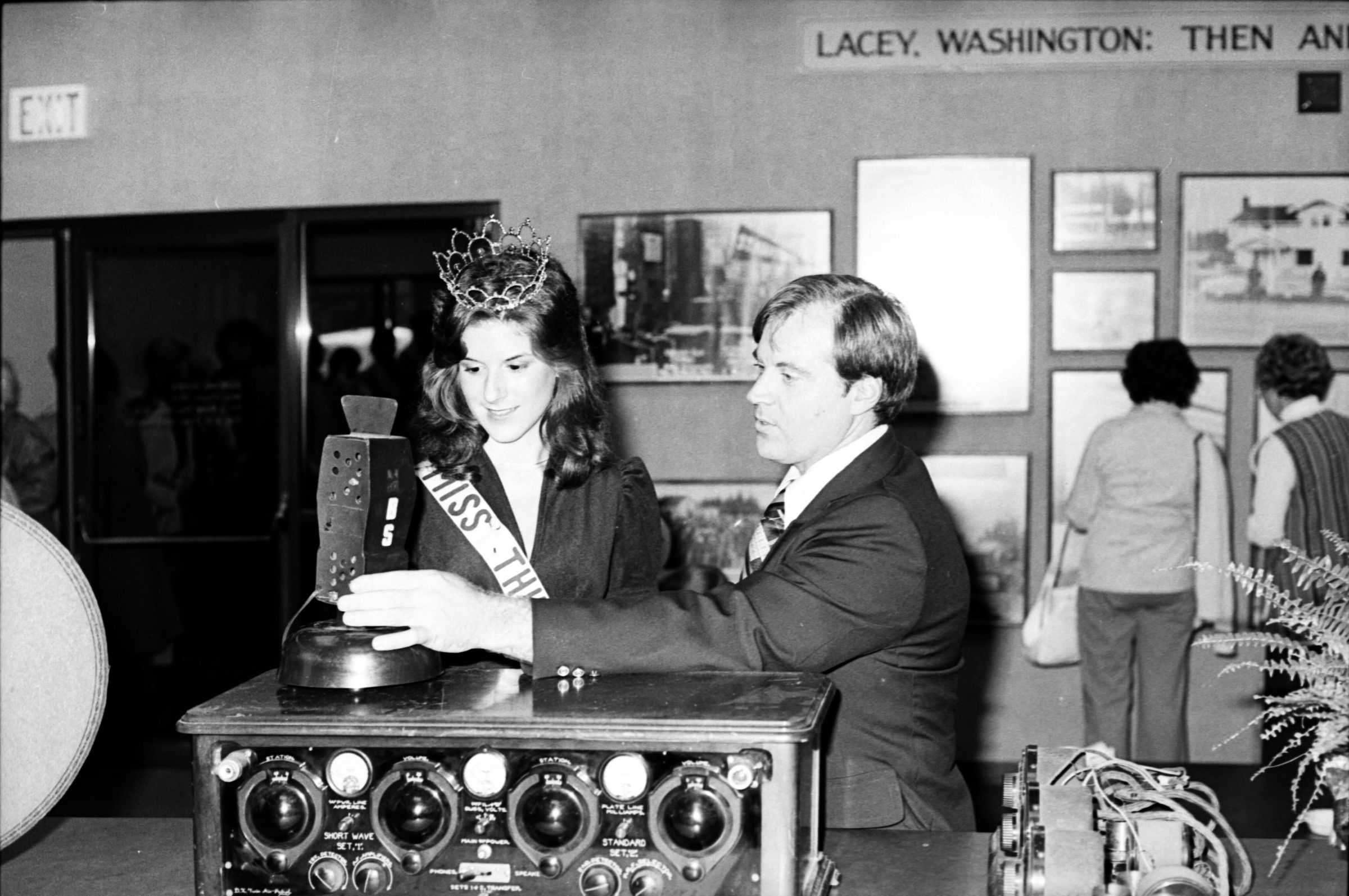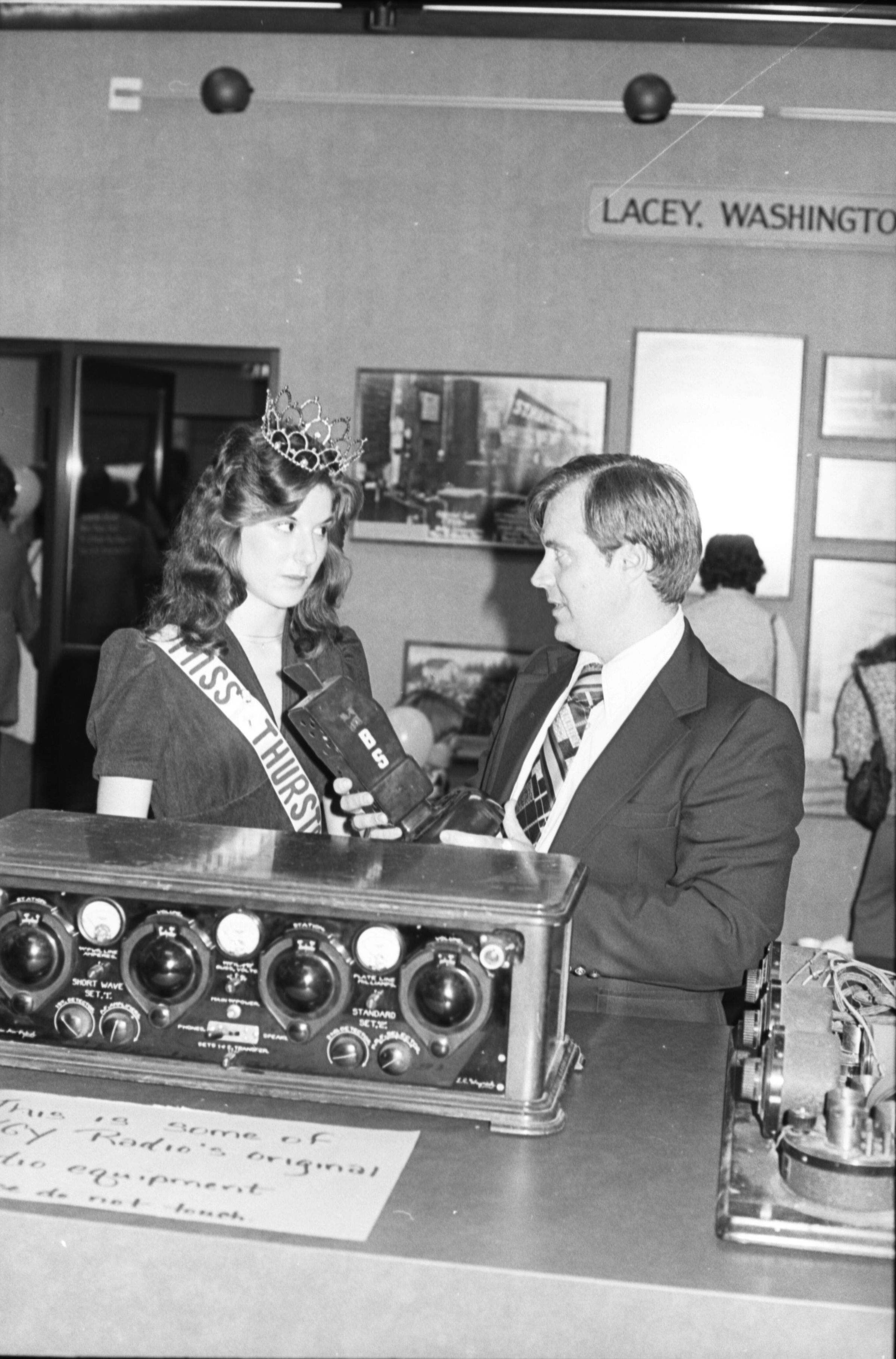 These 3 negative strips were created for the Lacey leader newspaper. The photos depict an event at the Lacey branch of the Bank of Olympia. Parts of the event featured here are a presentation by KGY of antique radio equipment from the station and a live appearance of one of KGY's radio DJ's with Miss Thurston County. There are large photos on some of the bank interior walls showing historic scenes in Lacey and at St. Peter's Hospital. There is also a chest full of coin-shaped, foil-wrapped chocolate and some activity that requires an easel.Made/Created