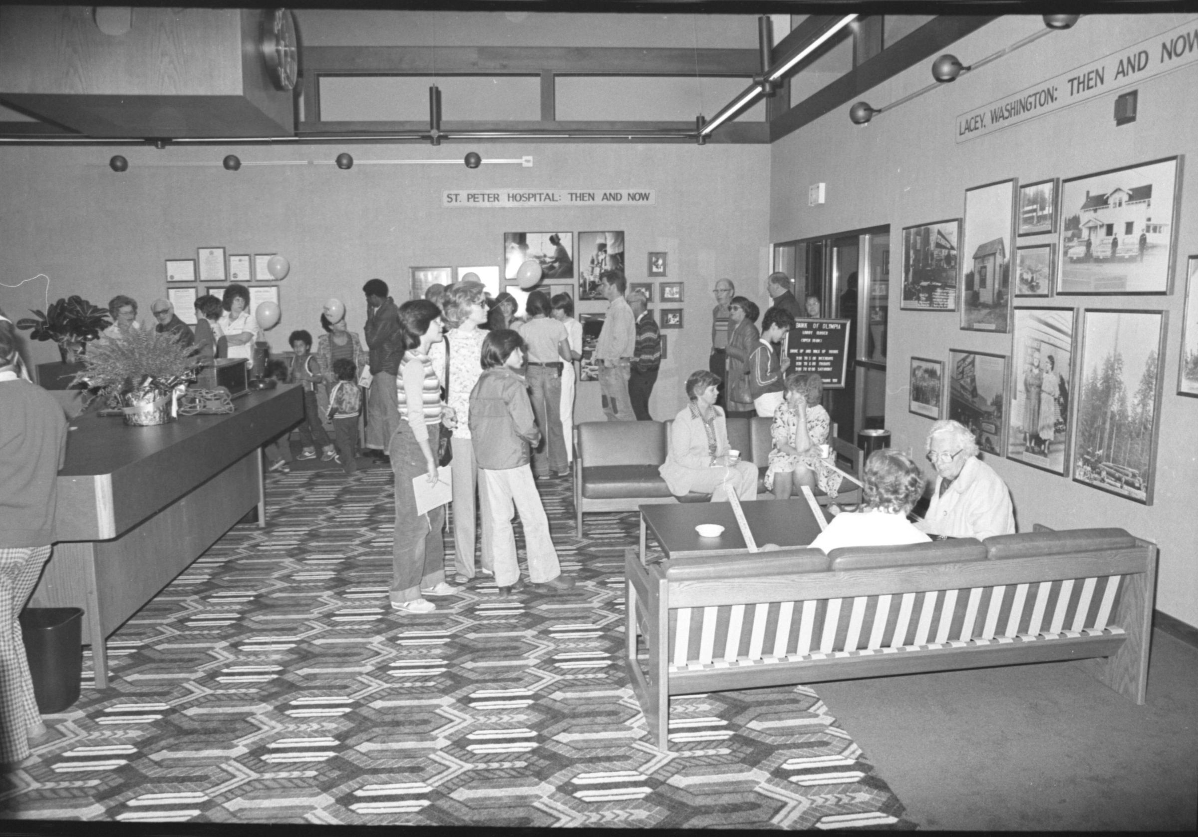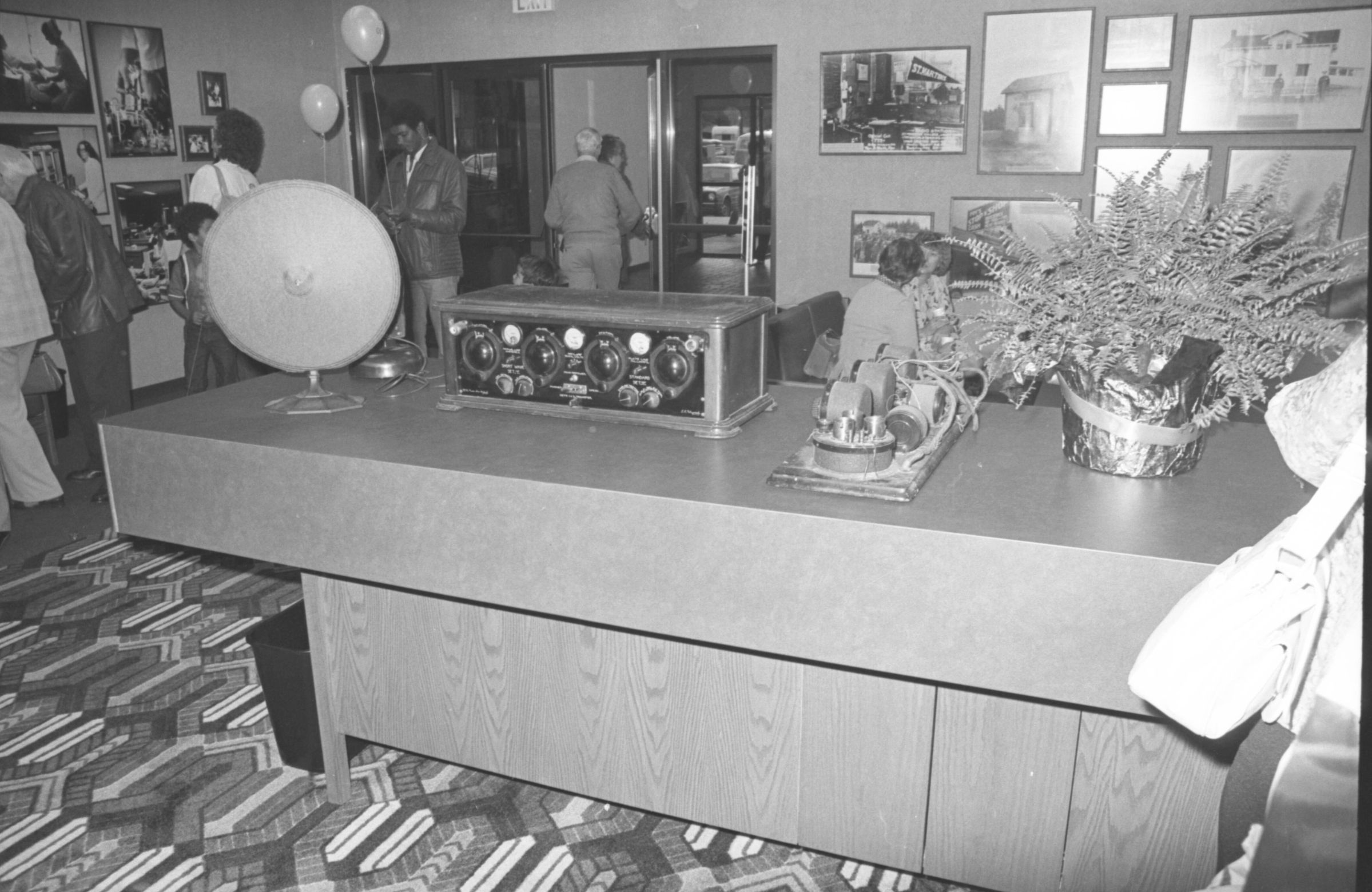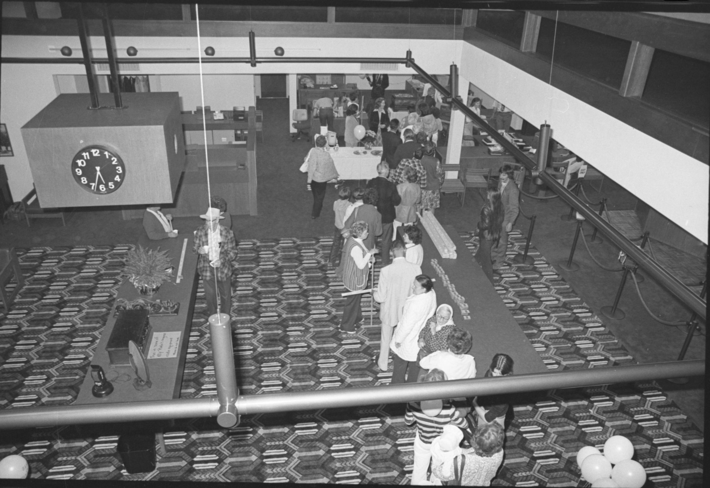 These 3 negative strips were created for the Lacey leader newspaper. The photos depict an event at the Lacey branch of the Bank of Olympia. Parts of the event featured here are a presentation by KGY of antique radio equipment from the station and a live appearance of one of KGY's radio DJ's with Miss Thurston County. There are large photos on some of the bank interior walls showing historic scenes in Lacey and at St. Peter's Hospital. There is also a chest full of coin-shaped, foil-wrapped chocolate and some activity that requires an easel.Made/Created