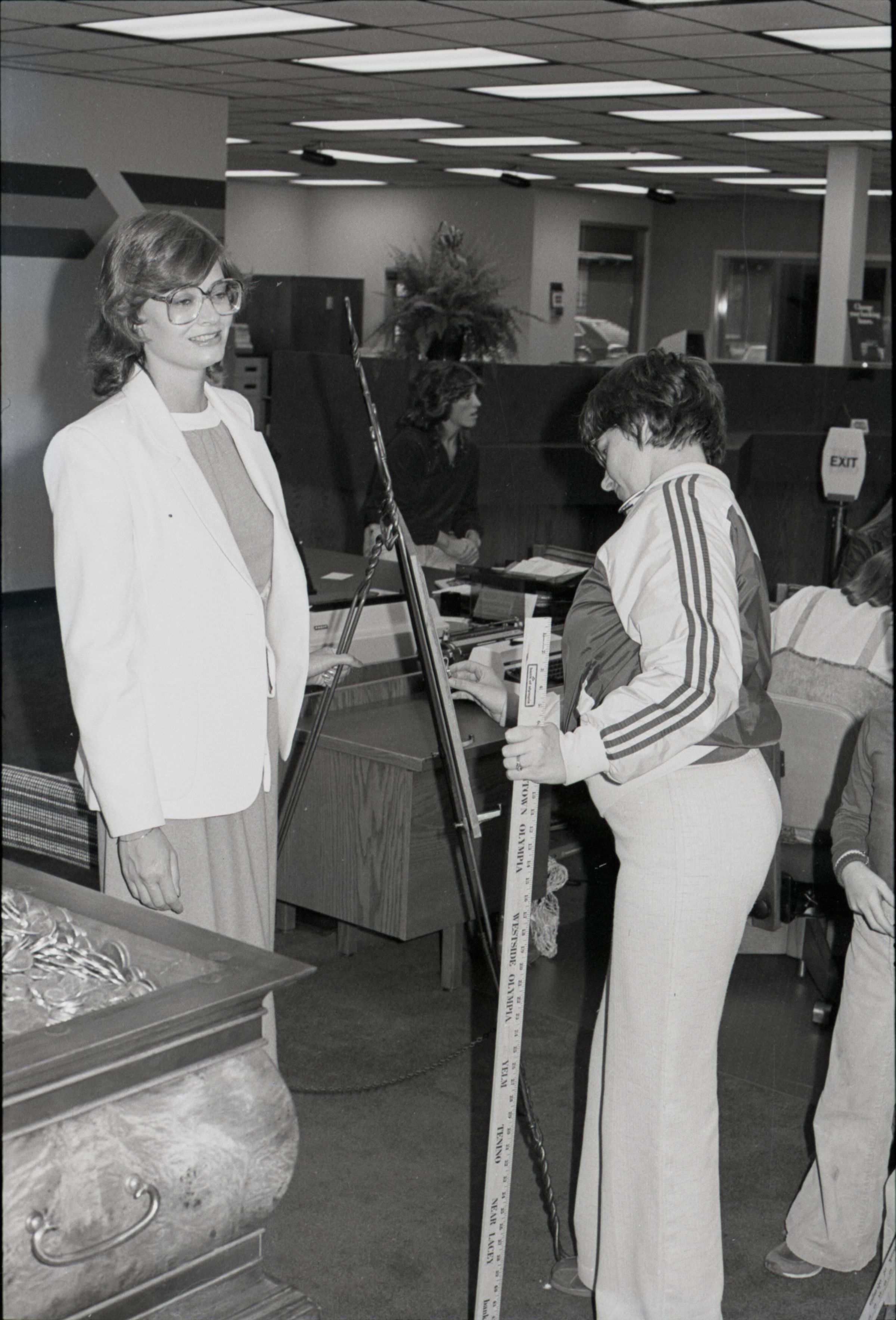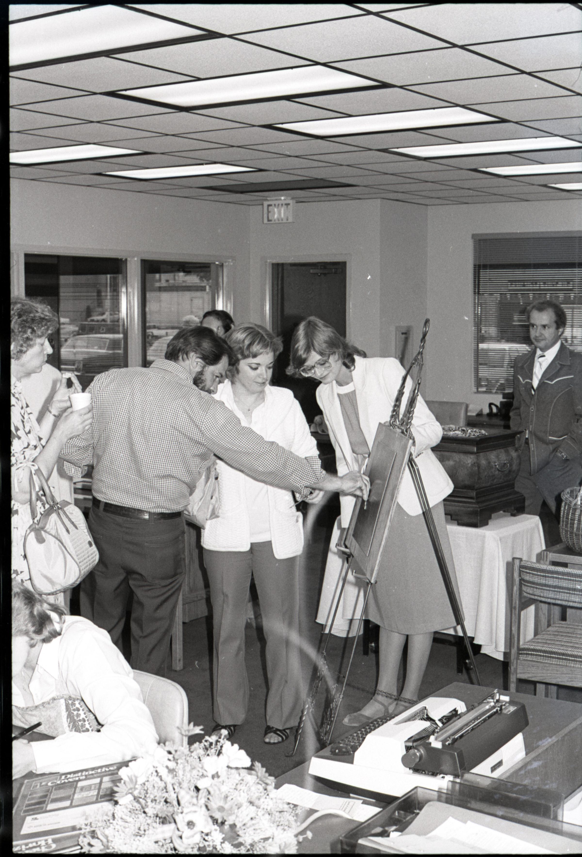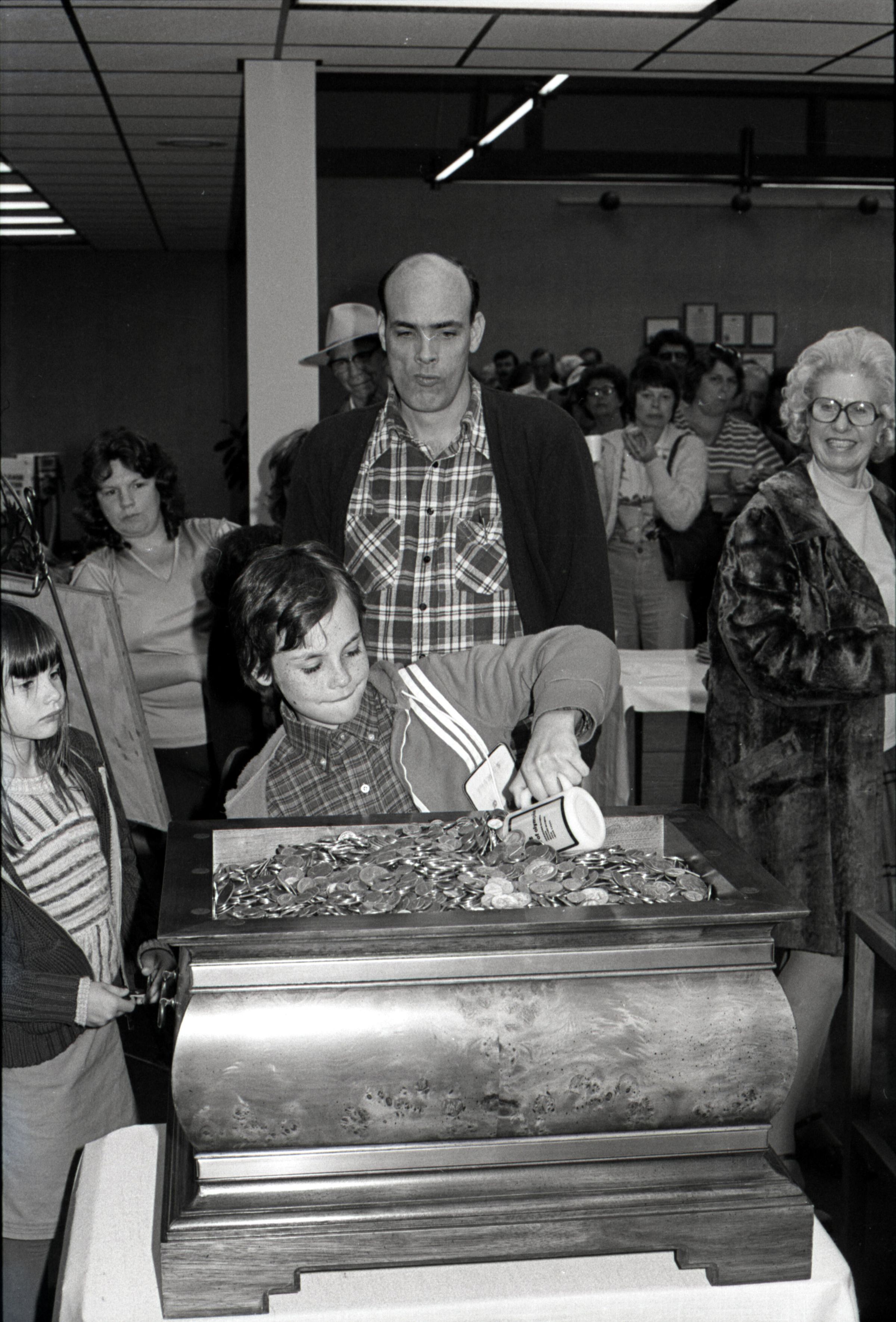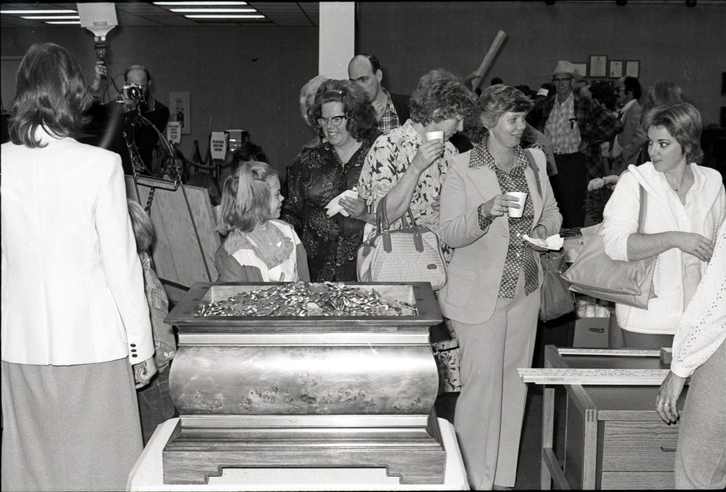 These 3 negative strips were created for the Lacey leader newspaper. The photos depict an event at the Lacey branch of the Bank of Olympia. Parts of the event featured here are a presentation by KGY of antique radio equipment from the station and a live appearance of one of KGY's radio DJ's with Miss Thurston County. There are large photos on some of the bank interior walls showing historic scenes in Lacey and at St. Peter's Hospital. There is also a chest full of coin-shaped, foil-wrapped chocolate and some activity that requires an easel.Made/Created