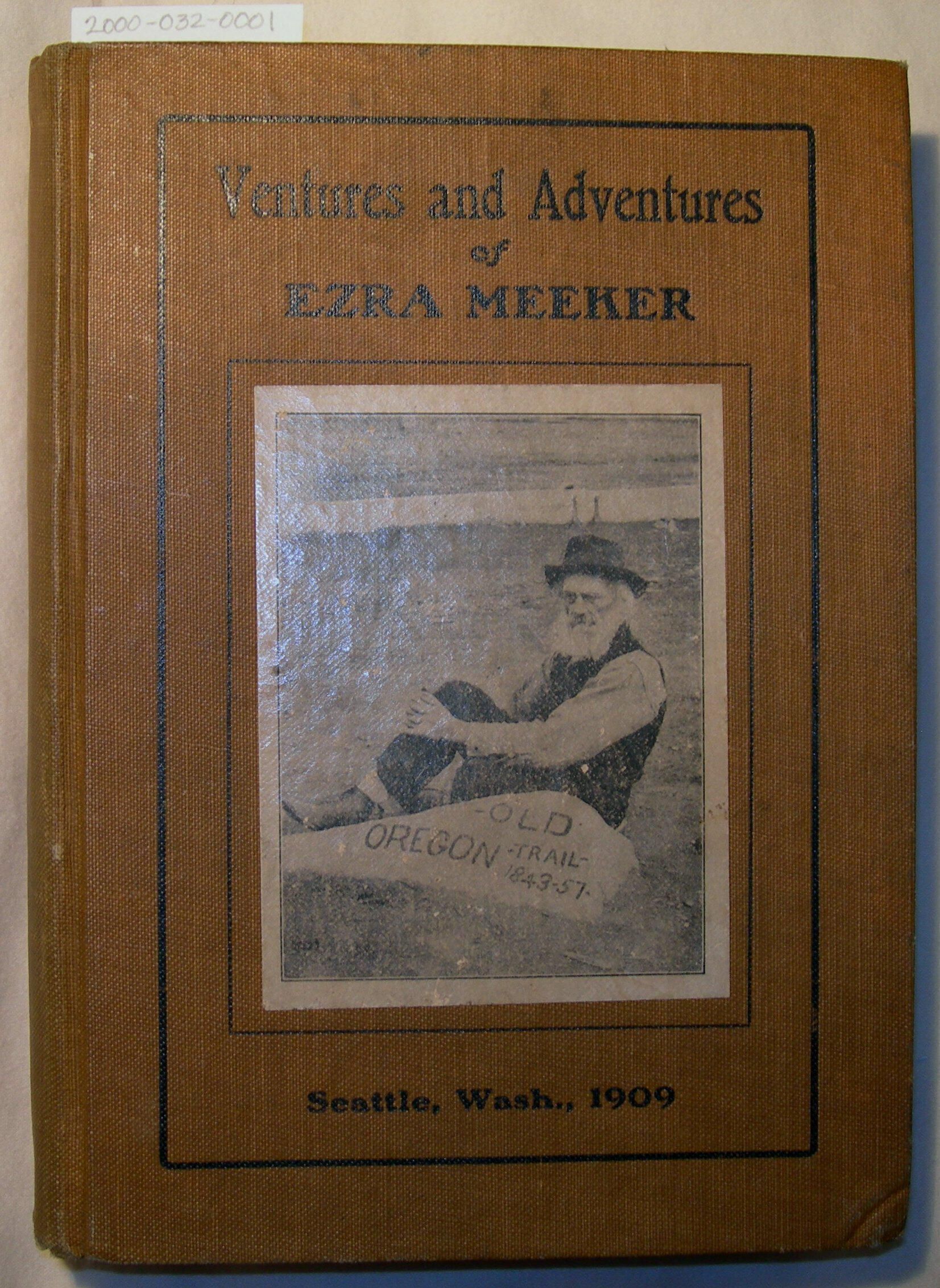 Brown hardback cover with thin black border and a photograph of Ezra Meeker in the center. Above: "Ventures and Adventures of Ezra Meeker" and below "Seattle, Wash., 1909."