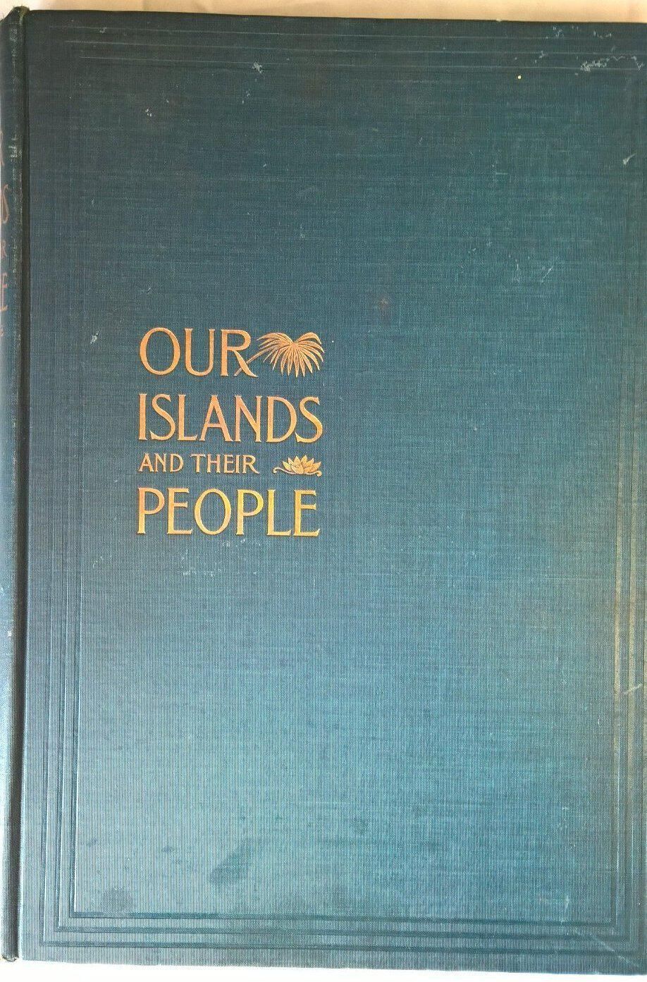 Dark green hard-back cover. The title "Our Islands and Their People", in addition to a palm branch and another type of flora impressed in golden letters half way down and off center to the left. Around the edge of the front cover are three consecutive depressed lines that run the entire perimeter of the cover. On the spine impressed in dark gold lettering is the title "Our Islands and Their People Volume I". The back cover is blank. Measures 16" x 11.5" x 1.5"