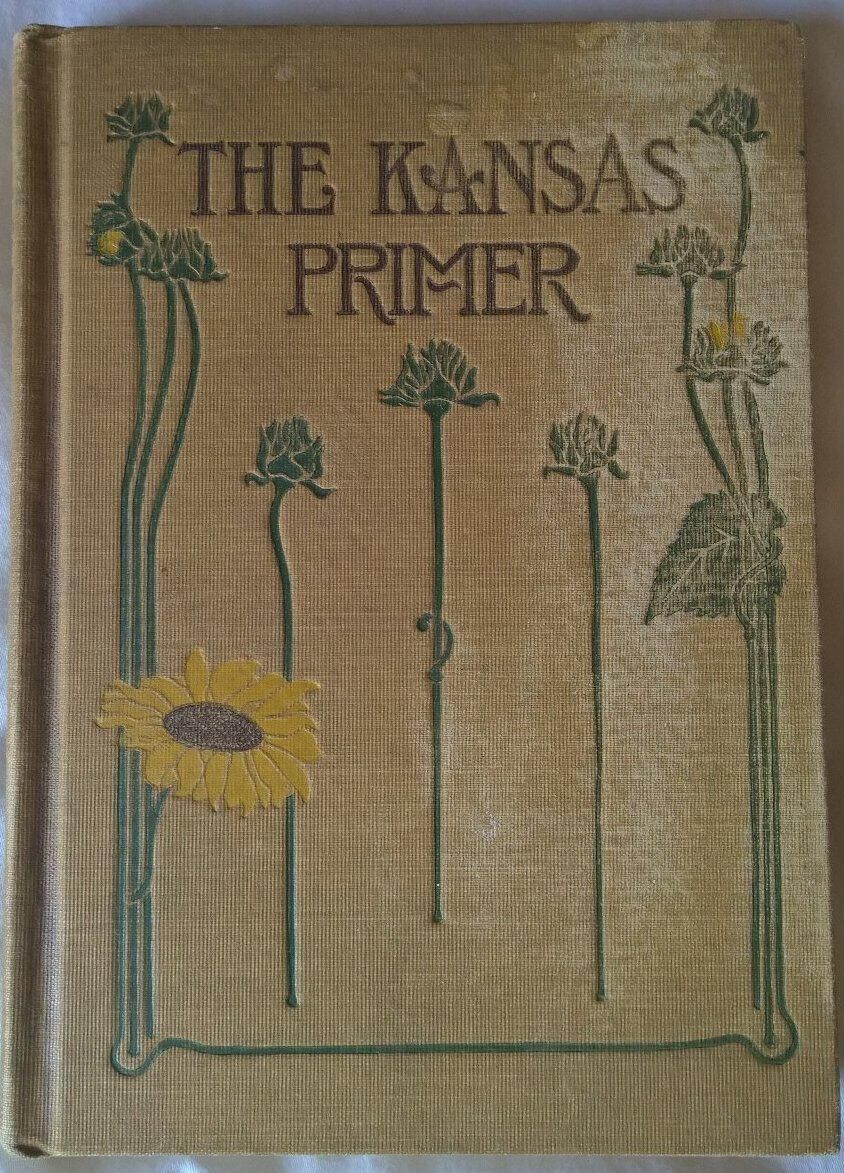 7.5" x 5.5" x 0.5". Brown, hard-backed cover. At the top of the front cover, impressed with dark brown ink is "The Kansas Primer". The rest of the front cover is illustrated with sunflower stalks and one flower. The stalks are green and the flower has yellow petals and a brown center. The spine has the words "Kansas Readers - Primer" impressed in dark brown ink. The back cover has no decoration.Lexicon