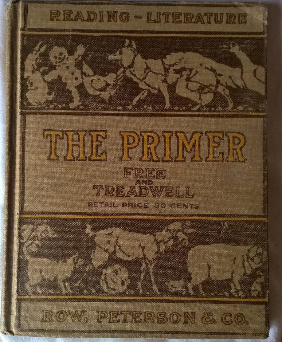 7.5" x 6" x 0.5". Hard-backed brown cover. At the top of the front cover in yellow ink outlined in brown ink is written "Reading-Literature". Just below that is a strip of creatures associated with the reading material inside done in negative space with the brown ink background outlining creatures. In the middle is the title "The Primer" above "Free and Treadwell" in the yellow bordered in brown, then just below that in brown is "Retail Price 30 Cents." Below the words is another illustrative strip of creatures in the same negative pace style as the strip above. At the bottom of the cover in yellow bordered in brown is "Row, Peterson & Co." The spine has "Reading Literature - Primer" printed in brown ink. The back cover has only a crest printed in the middle, depicting an open book with possibly an arrow pointing down through it and scroll work below and to the sides of the book.Lexicon