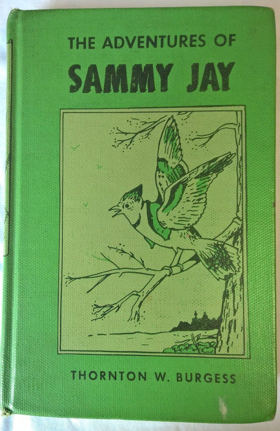 On the front cover stamped in black at the top center is the title, "The Adventures of Sammy Jay". Below that in the center of the cover in a combination of a light green and black ink is stamped image of a blue jay bird on a tree branch with his wings extended behind him. At the bottom center of the cover is stamped in black ink the author's name "Thornton W. Burgess".