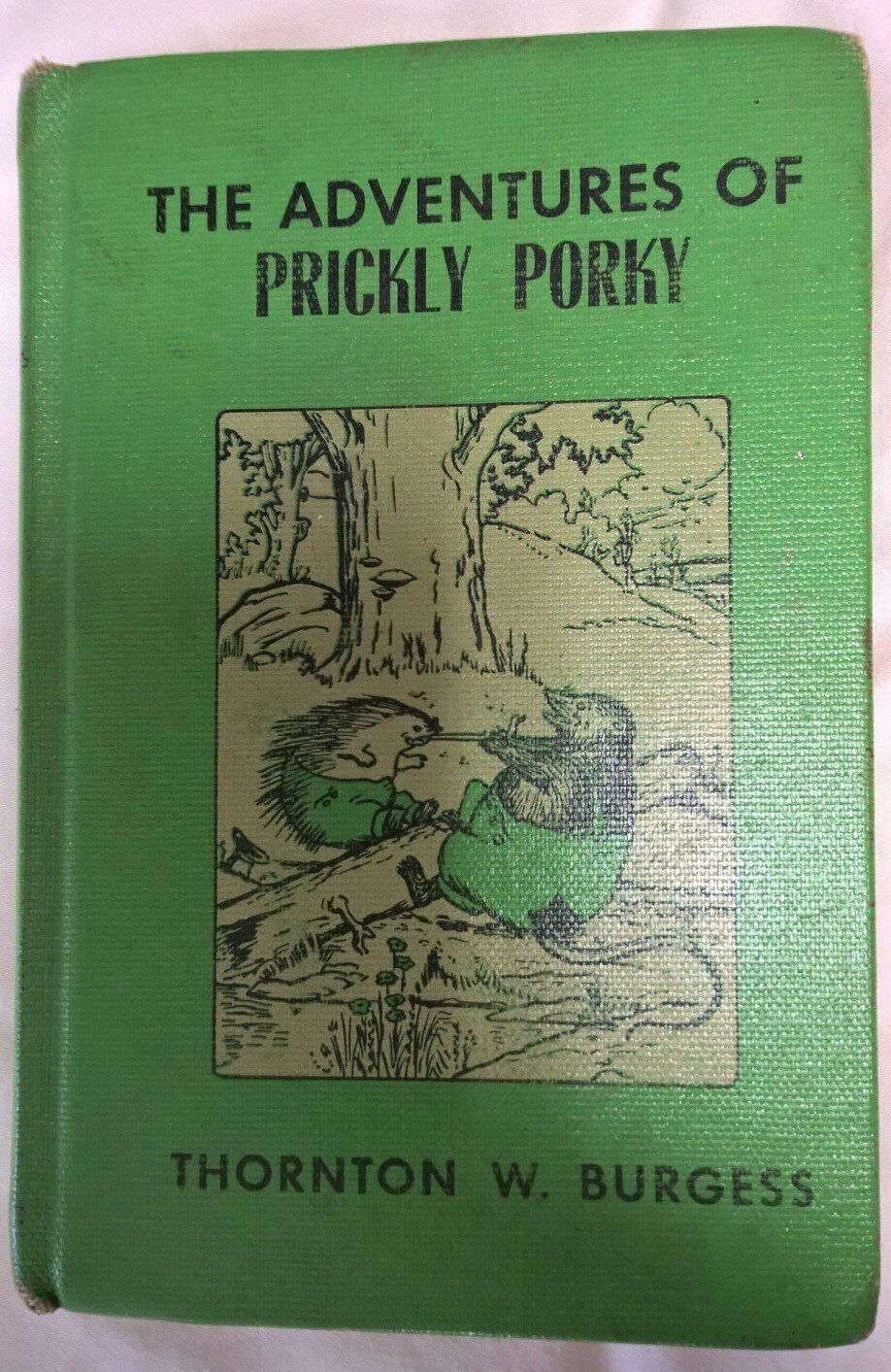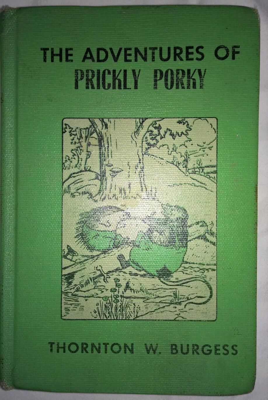 On the front cover centered at the top stamped in black ink is "The Adventures of Prickly Porky" in the center of the cover in black and a light shade of green ink is stamped a picture of two animals wearing human style pants sitting on a grassy bank with a log between them and a tree in the back ground. Below the picture stamped in black ink is "Thornton W. Burgess".