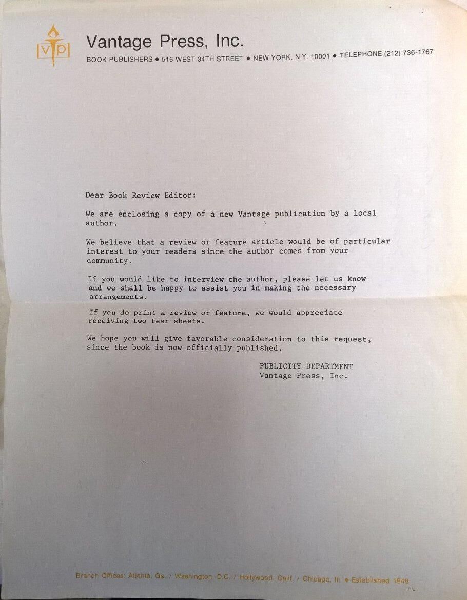 From the Vantage Press Inc, to a book review editor encouraging a review of the book since the author was from the area. On the back is some handwriting "March not May", "Crabtree Tenn?", "Mongomery", and