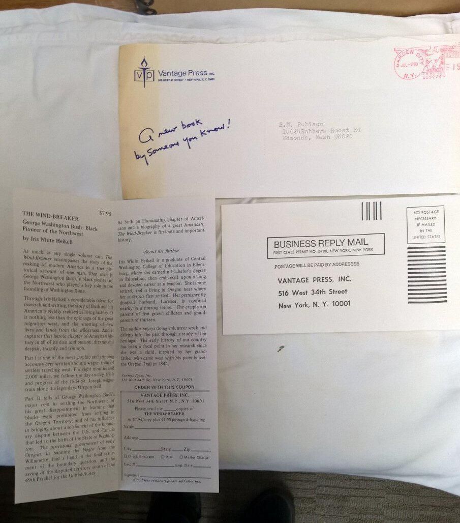 From Vantage Press addressed to R.M. Robinson 10628 Robbers Roost Rd Wdmonds[sic], Wash 98020. Written next to address is "A new book by someone you know!" Inside is a leaflet with the book cover on one side and synopsis on the other with a coupon to order the book. it also includes a Business Reply Mail envelope.