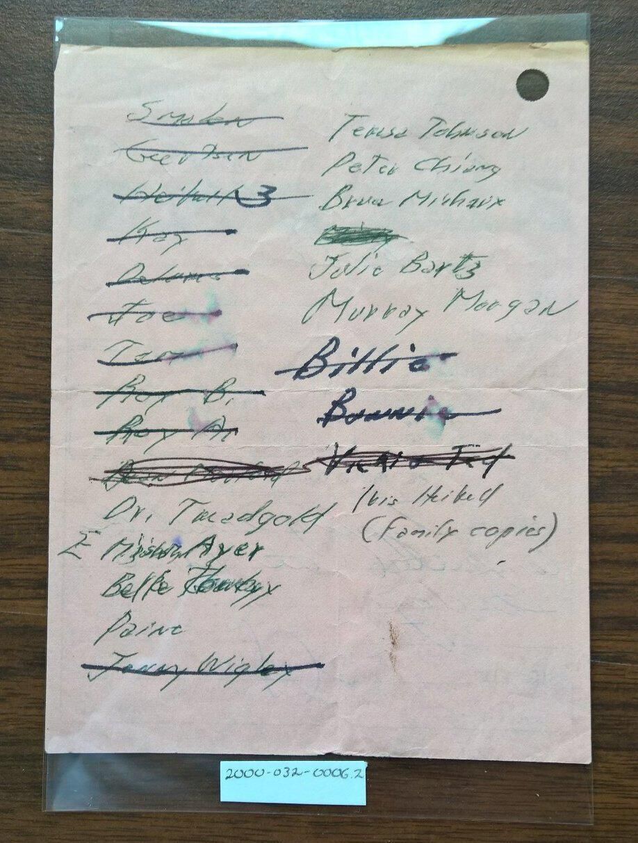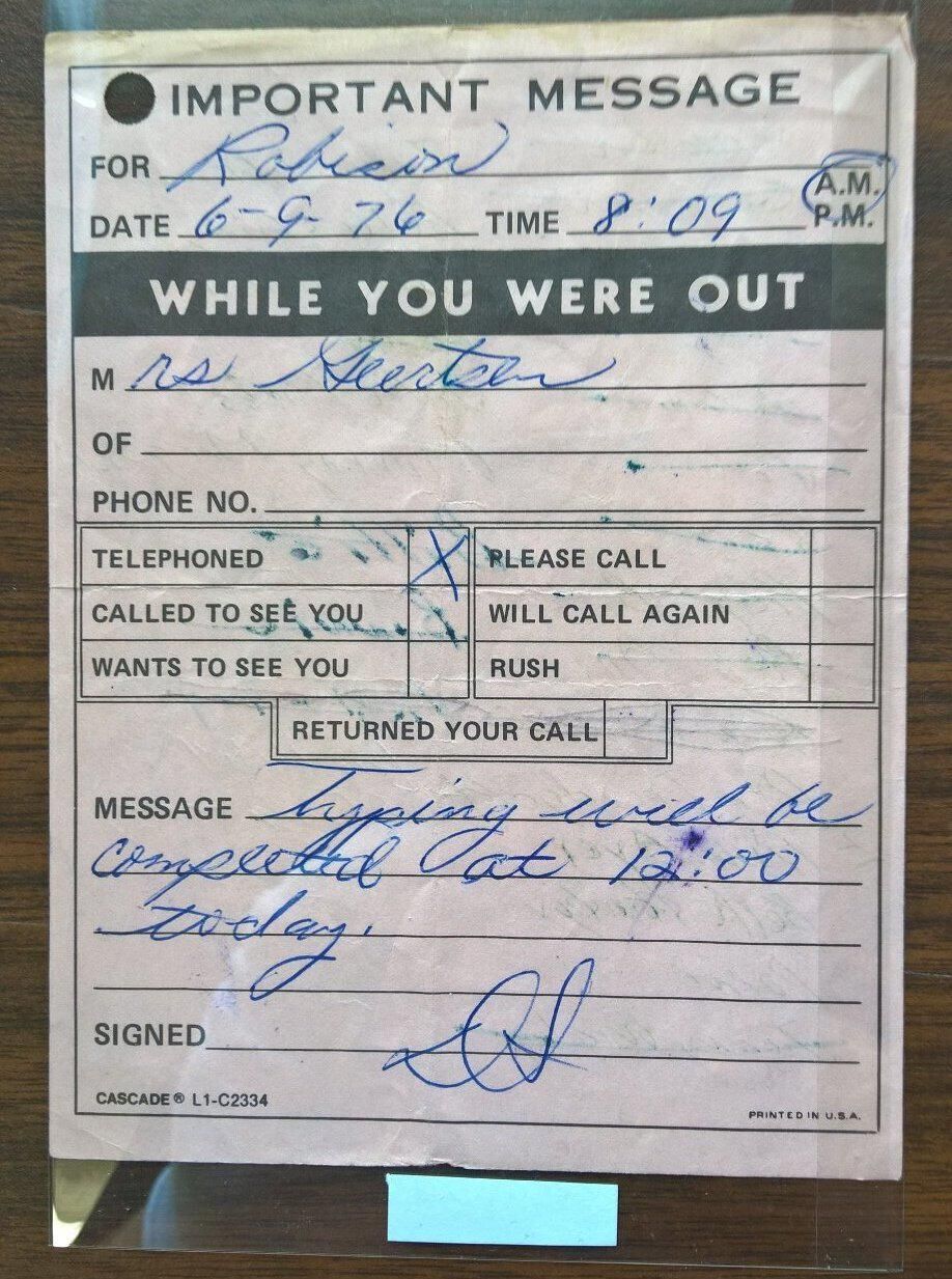 2000-032-0006.2 is a pink message slip. It was placed in the spine crease between the title page and the table of contents page. On the back is a list of names with many of them crossed out. On the front is a message for Robison dated 6-9-76 at 8:09 am letting them know that the "typing will be done at 12:00 today."