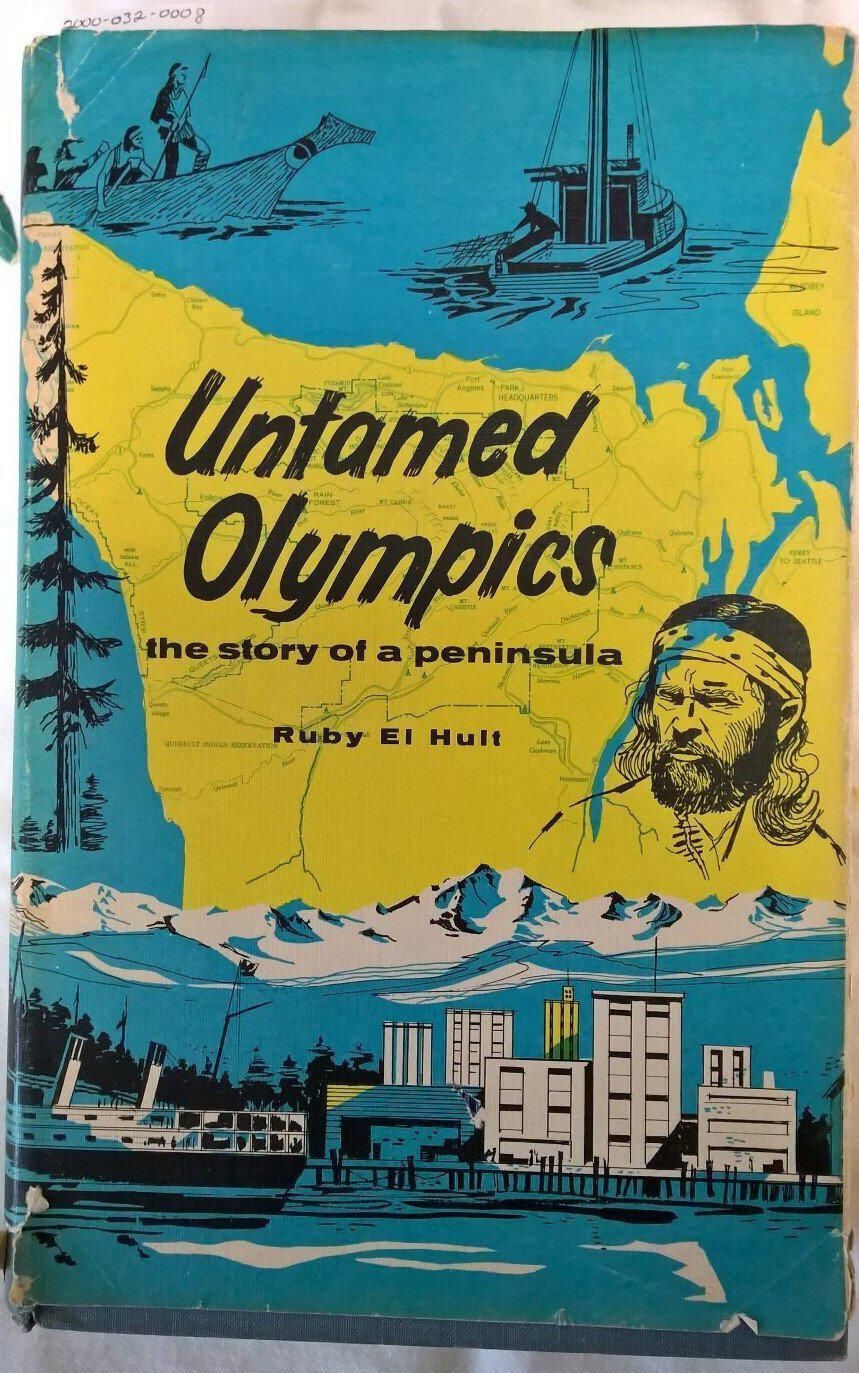 The book is hardbound in a light blue cover with a paper wrap around cover. The paper cover is a turquoise color with yellow and white highlights. The front cover has the title and author's name with depictions of Washington's Olympic Peninsula mountains, trees, boats, skyline, and people. the spine has the title, author's last name, and publishers with a depiction of an oar and a pickax. the back cover has a list of other books about the historic northwest.Lexicon