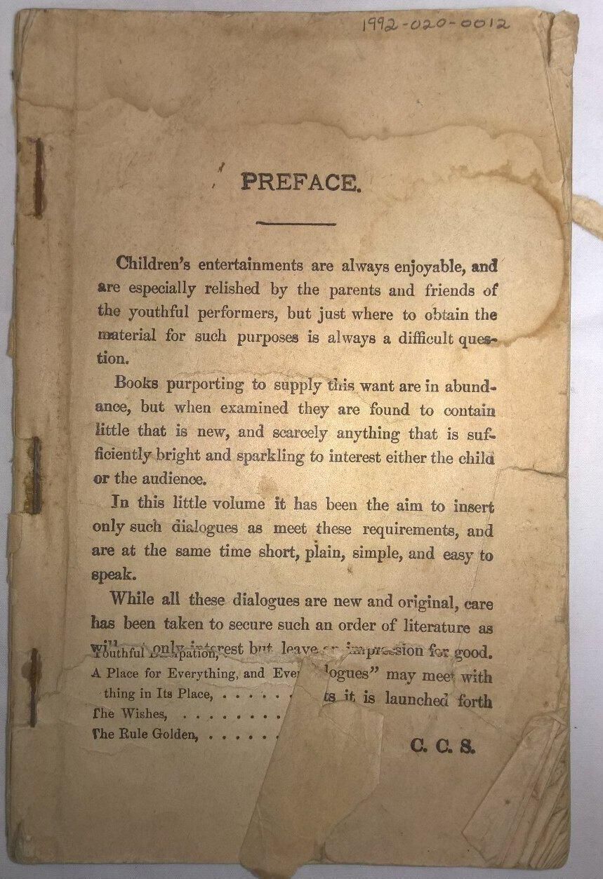 This book is a collection of short play scripts each only one or two scenes long. it was edited by Charles C. Shoemaker, who also wrote its preface. Reprinted several times it is unclear when this copy was published originally added to the Library of Congress in 1885 and first published in 1889 it was reprinted in 1913 as well.