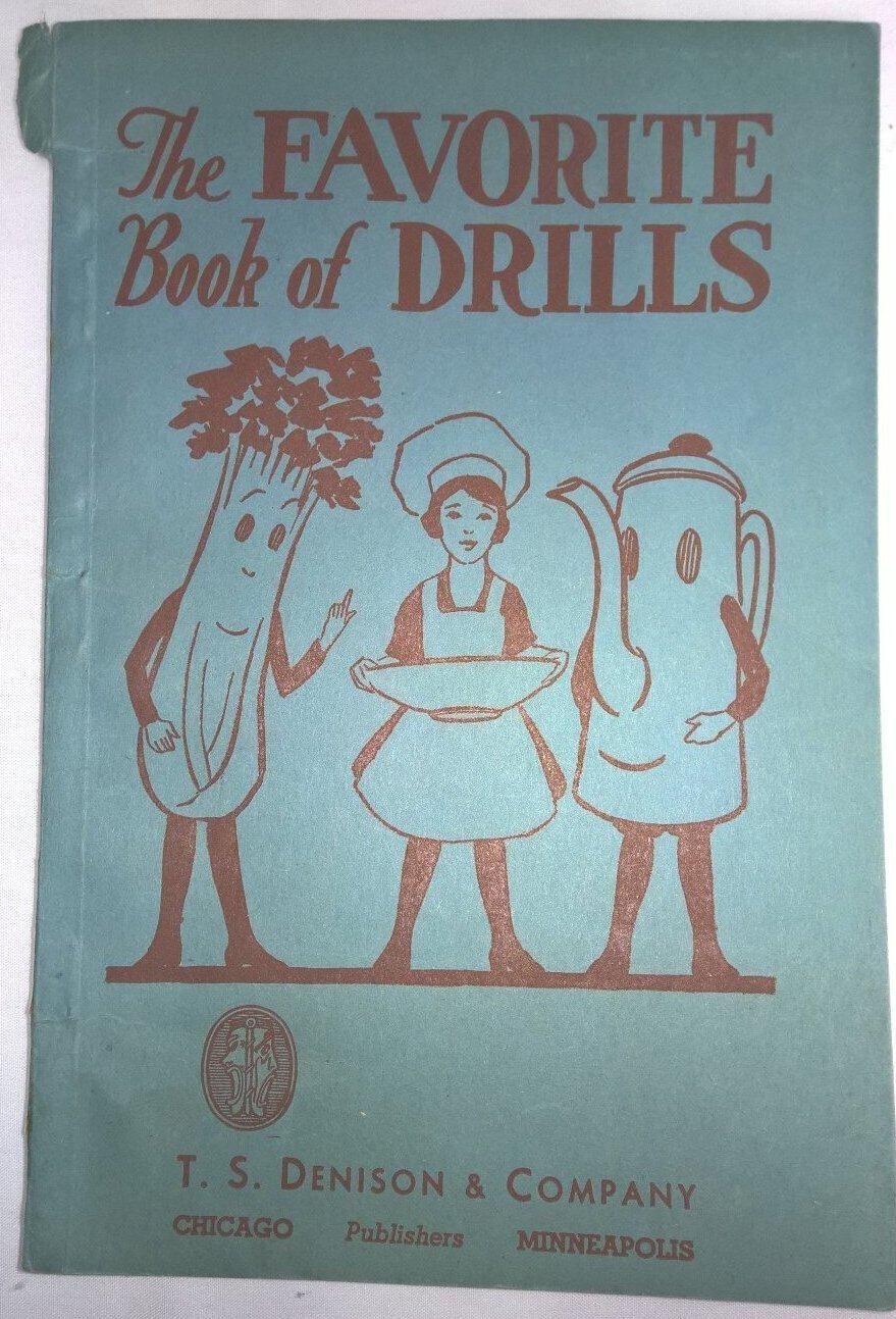 The cover is made of blue paper. In black on the front cover is the title, publisher, and a depiction of a girl in an apron holding an oversized bowl, with a person dressed as a bunch of celery on her right and a person dressed as a tea pot on her left. There is a publishers mark of a comedy/tragedy mask at the bottom.