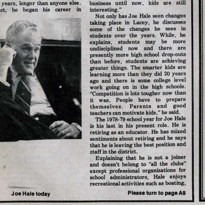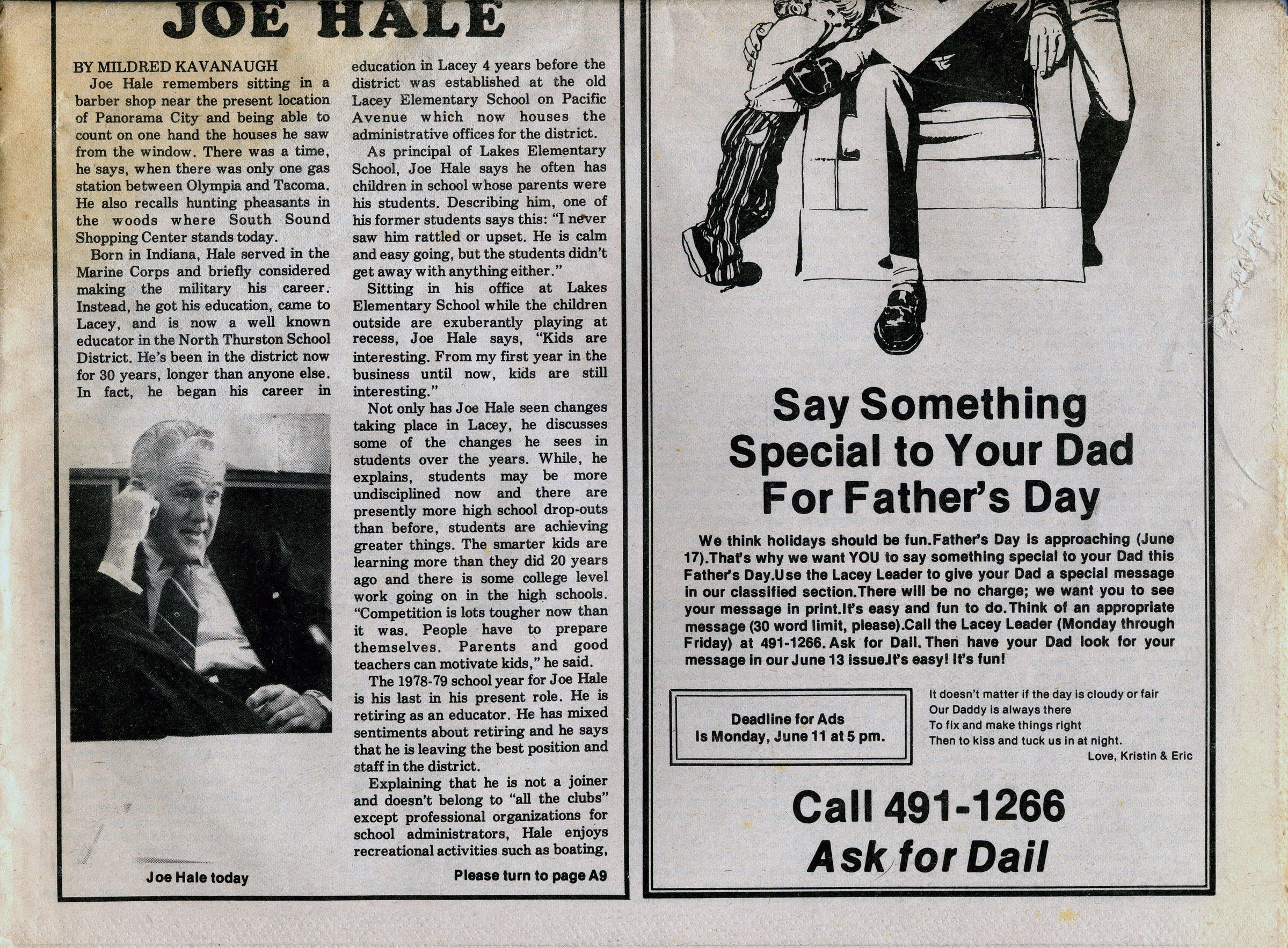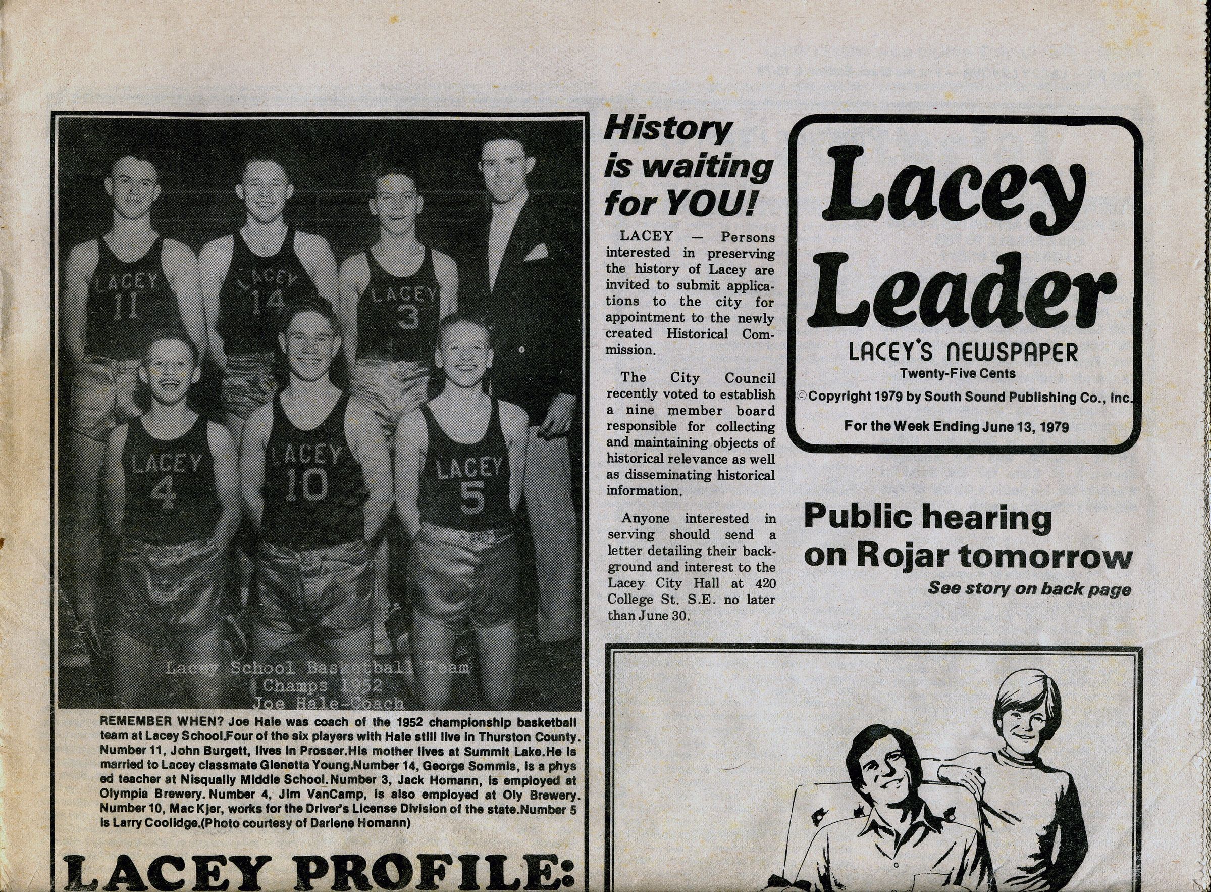 Front page of the Lacey Leader newspaper (scanned copy, 2 images) from June 13, 1979. There are three headlines: "History is waiting for you" (about the newly created Historical Commission), "Public hearing on Rojar tomorrow," (a story on the back page), and "Lacey Profile: Joe Hale" which is about the coach who took the Lacey School basketball team to win the championship in 1952. The article continues on another page (not included).