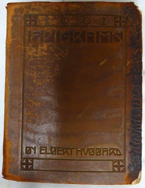 Front cover has title and author impressed into the leather in extreamly styalized lettering.