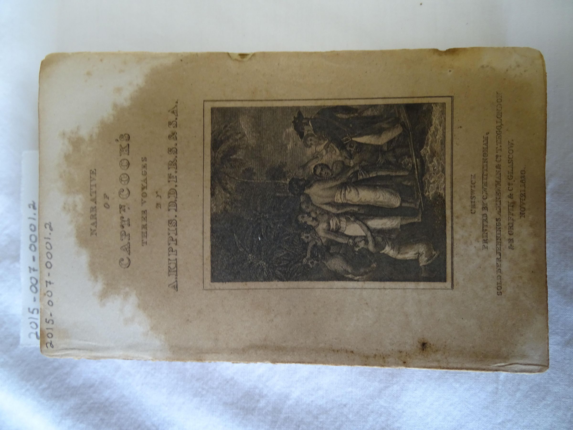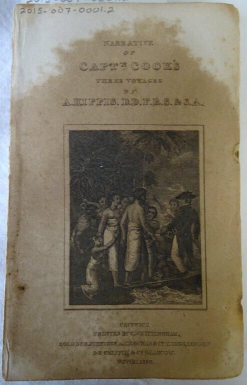 Coverless. Showing page on front is a title page with a depiction of Captain Cook meeting natives. the showing back page is blank.
