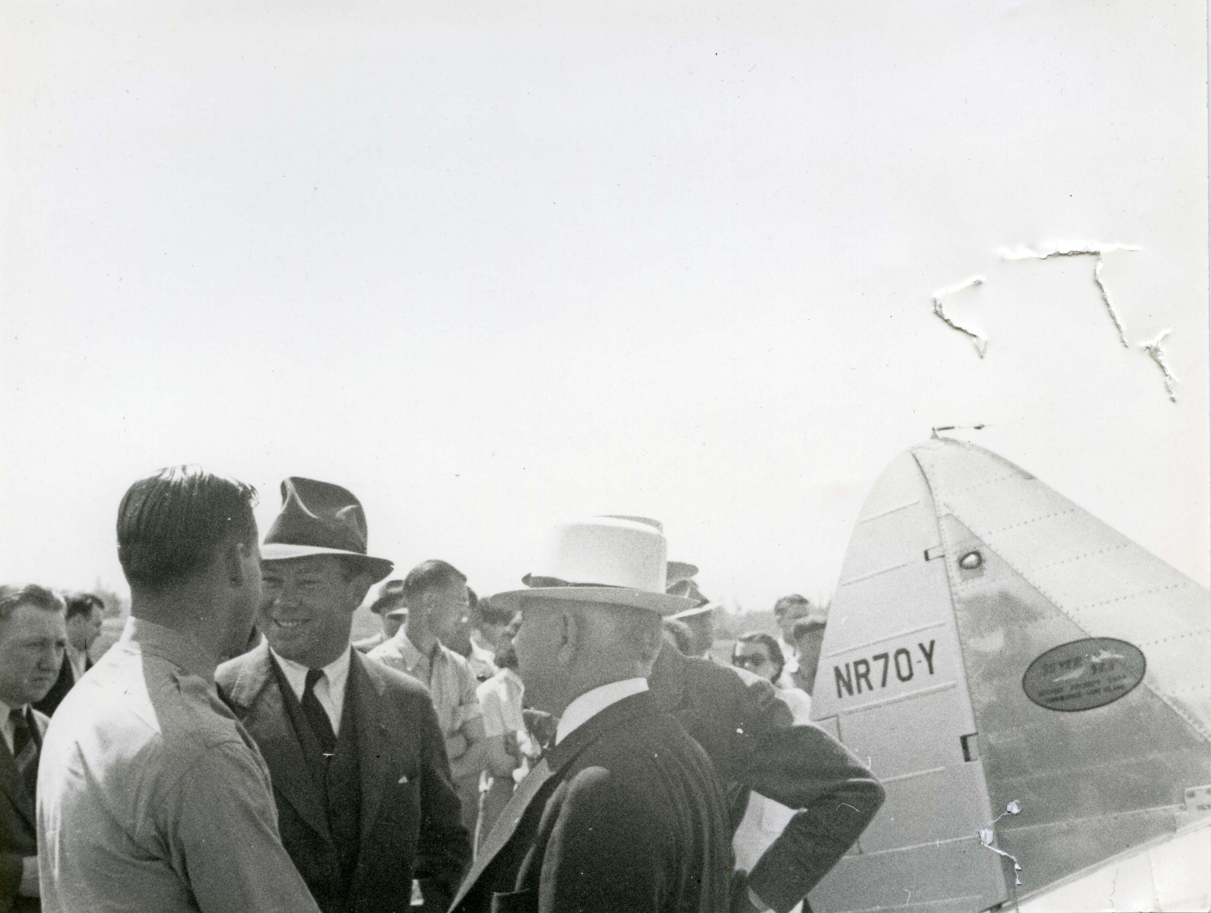 Black and white photograph (copy print) of (left to right) Frank Fuller, Jr., Jack R. Cram, and Olympia Mayor, David Gammell. Frank Fuller, Jr. visited the Olympia Airport in 1939 as part of a nationwide promotional tour for the Golden Gate International Exposition in San Francisco, California. Fuller's Seversky race plane is visible at right. Vivian Hicks is visible in the small crowd in the background near the aircraft.Context