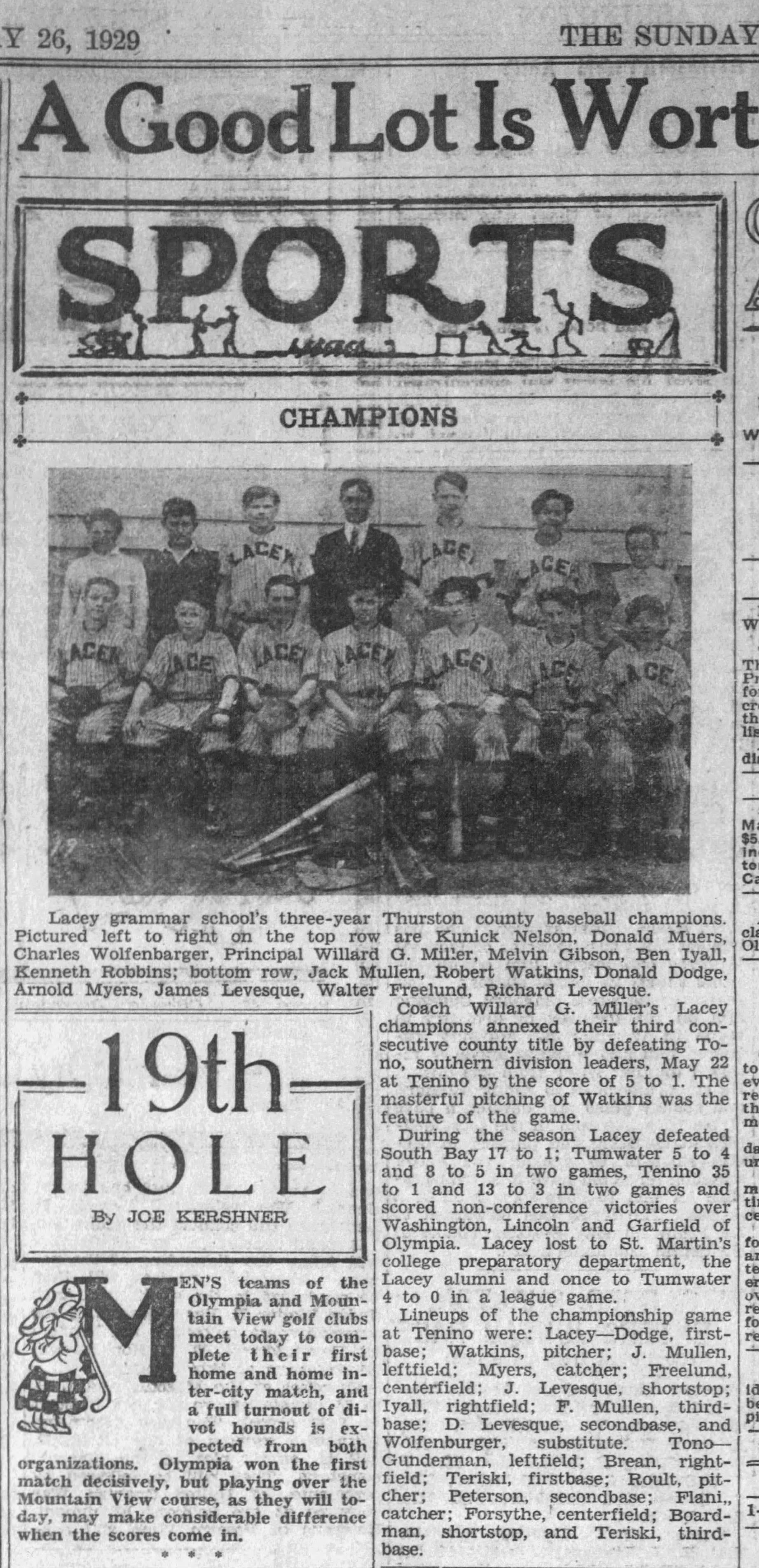 Trophy. Awarded to Lacey Baseball Team. 1929 champions. Thurston County Grade School League.