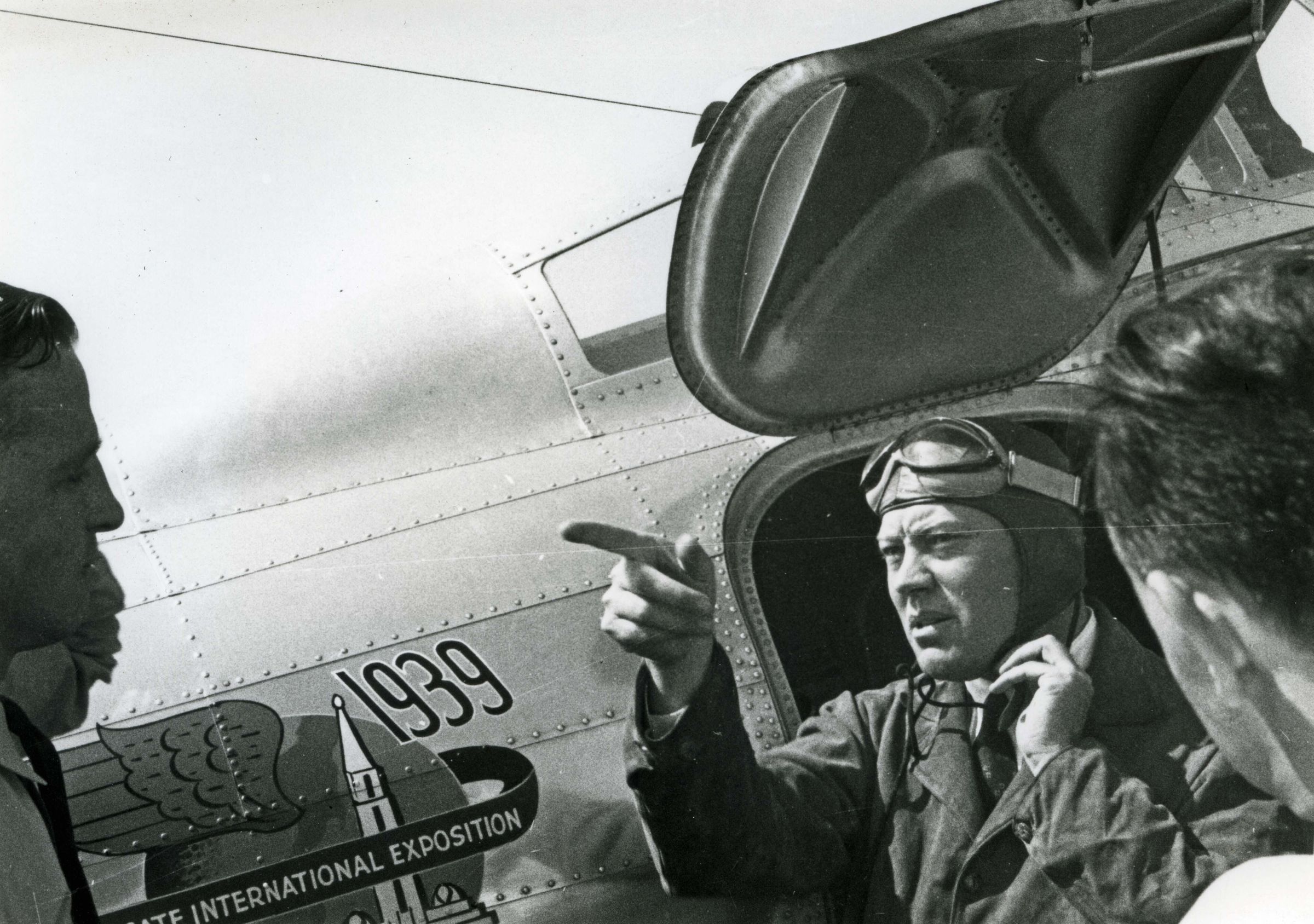 Promoting Golden Gate Exposition, Frank Fuller, this transcontinental Race plane visiting Olympia Airport 1939. Jack Cram (left), Gwin Hicks (right), picture compliments G. Dewey MartinLanguage