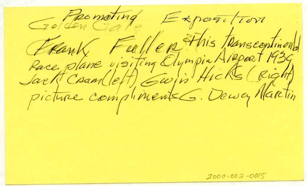Two black and white identical photographs (copy prints) of Frank Fuller, Jr. visiting the Olympia Airport in 1939 to promote the Golden Gate International Exposition in San Francisco, California. Also in the picture are Jack Cram, left, and Gwin F. Hicks, right. A small portion of his Seversky aircraft is pictured.Context