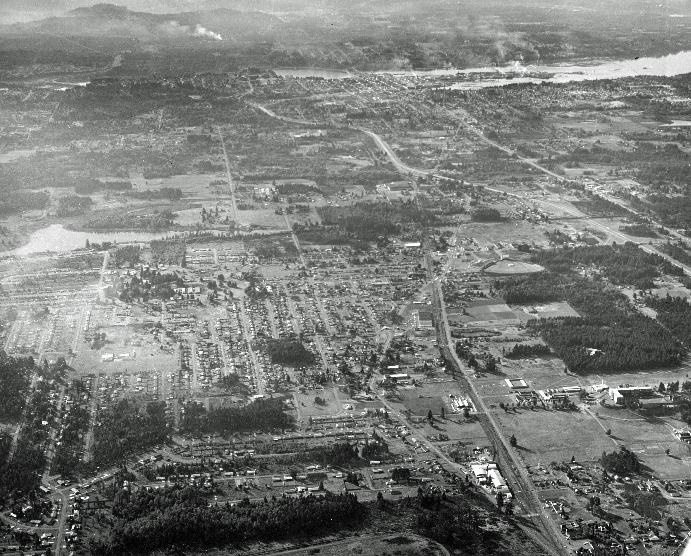 Black and white aerial photograph (scanned copy) over Lacey, looking west. The signature Lacey wedge of Lacey Boulevard and Pacific Avenue can be seen at the bottom center, with Lacey Plywood Company at the eastern edge (bottom). Saint Martin's College is to the north (right) of Pacific Avenue, and the Lacey-Drive In is at the western edge of the wedge. In the distance to the west (top) is Olympia and Budd Inlet. To the south (left is Chambers Lake).Made/Created