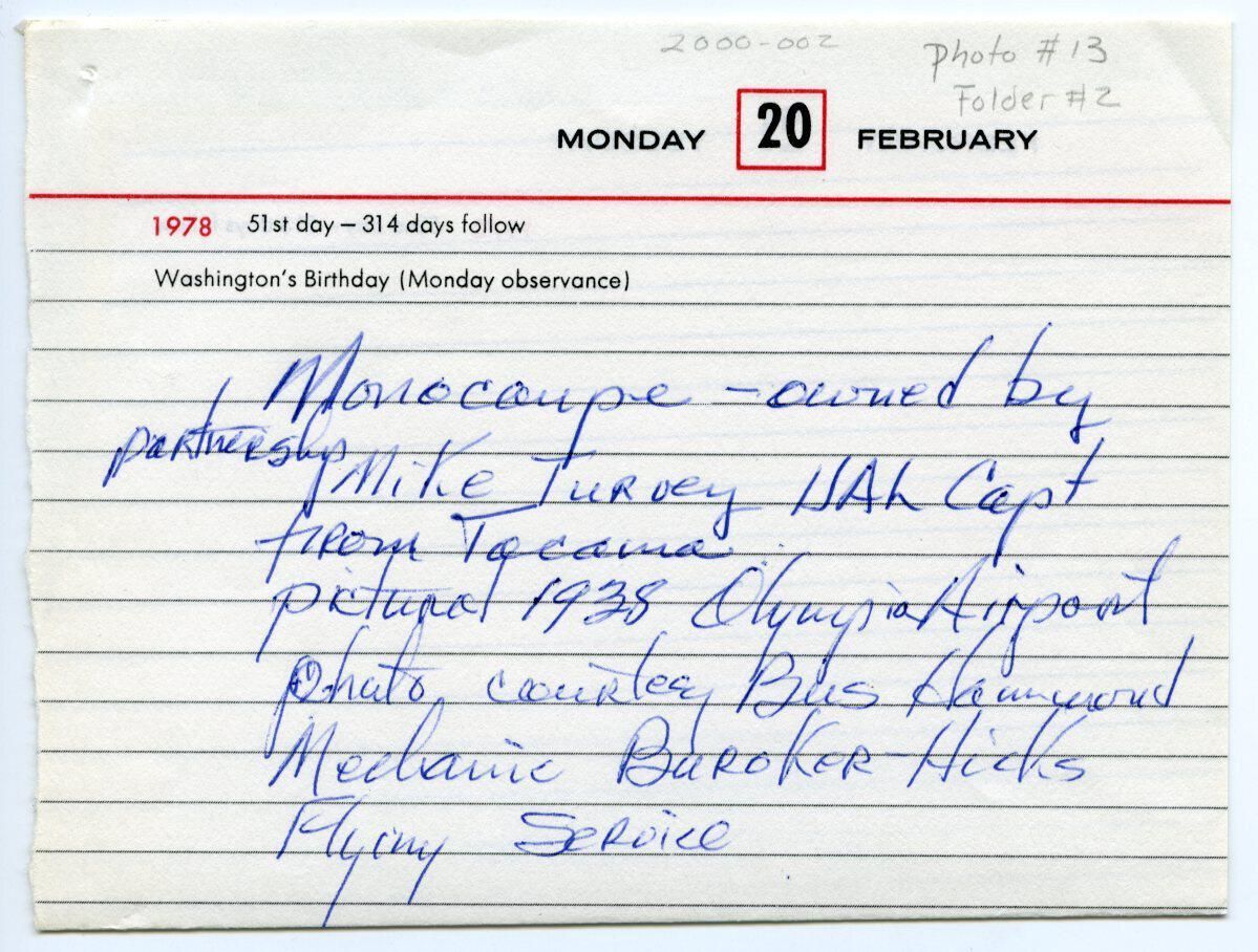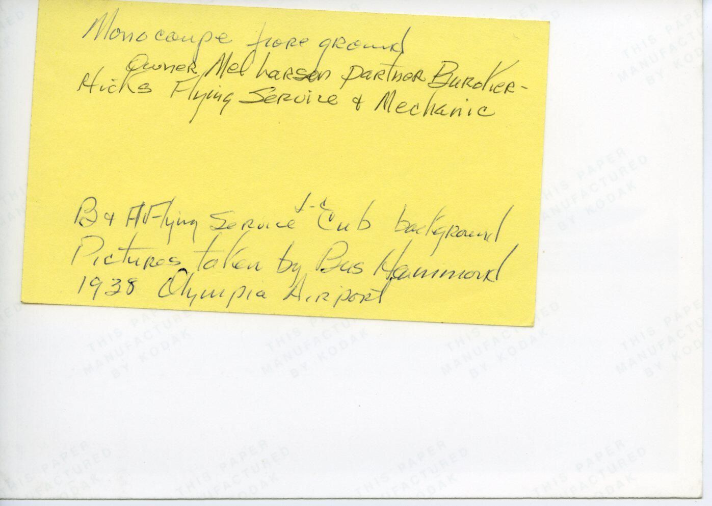Two copy prints of a Monocoupe aircraft at the Olympia Airport, 1938. Aircraft was owned by Mel Larson, partner and mechanic at Buroker-Hicks Flying Service, and Mike Turvey, United Airlines Captain from Tacoma.Made/Created