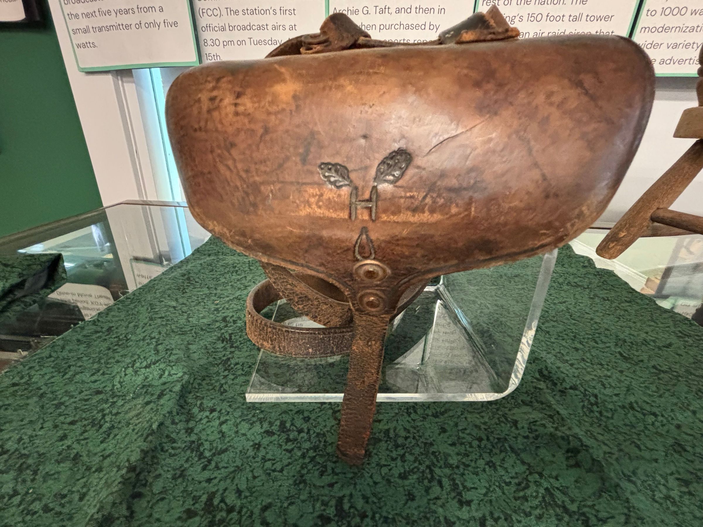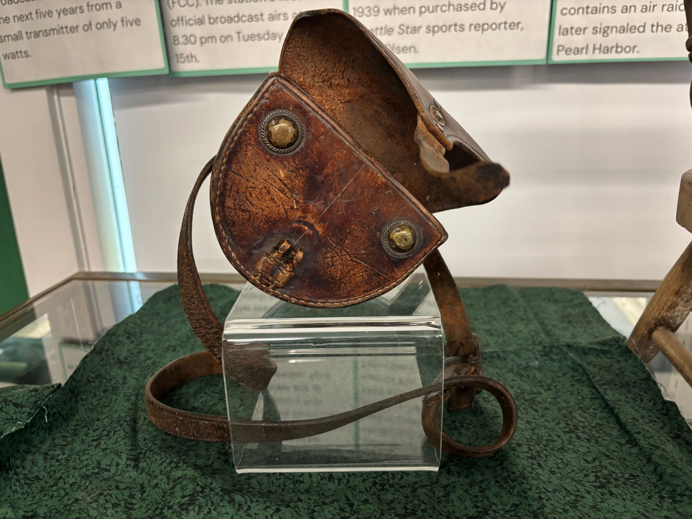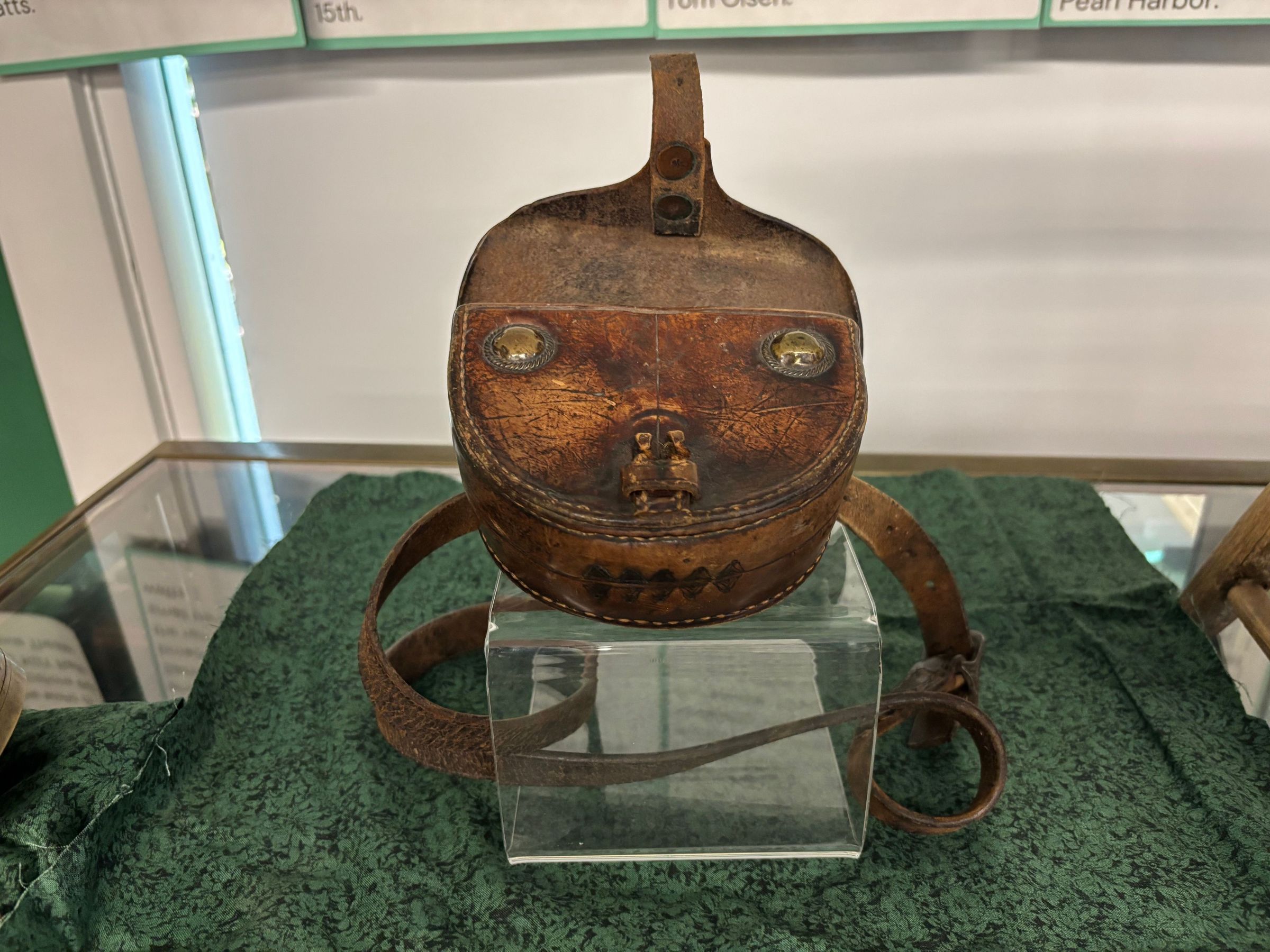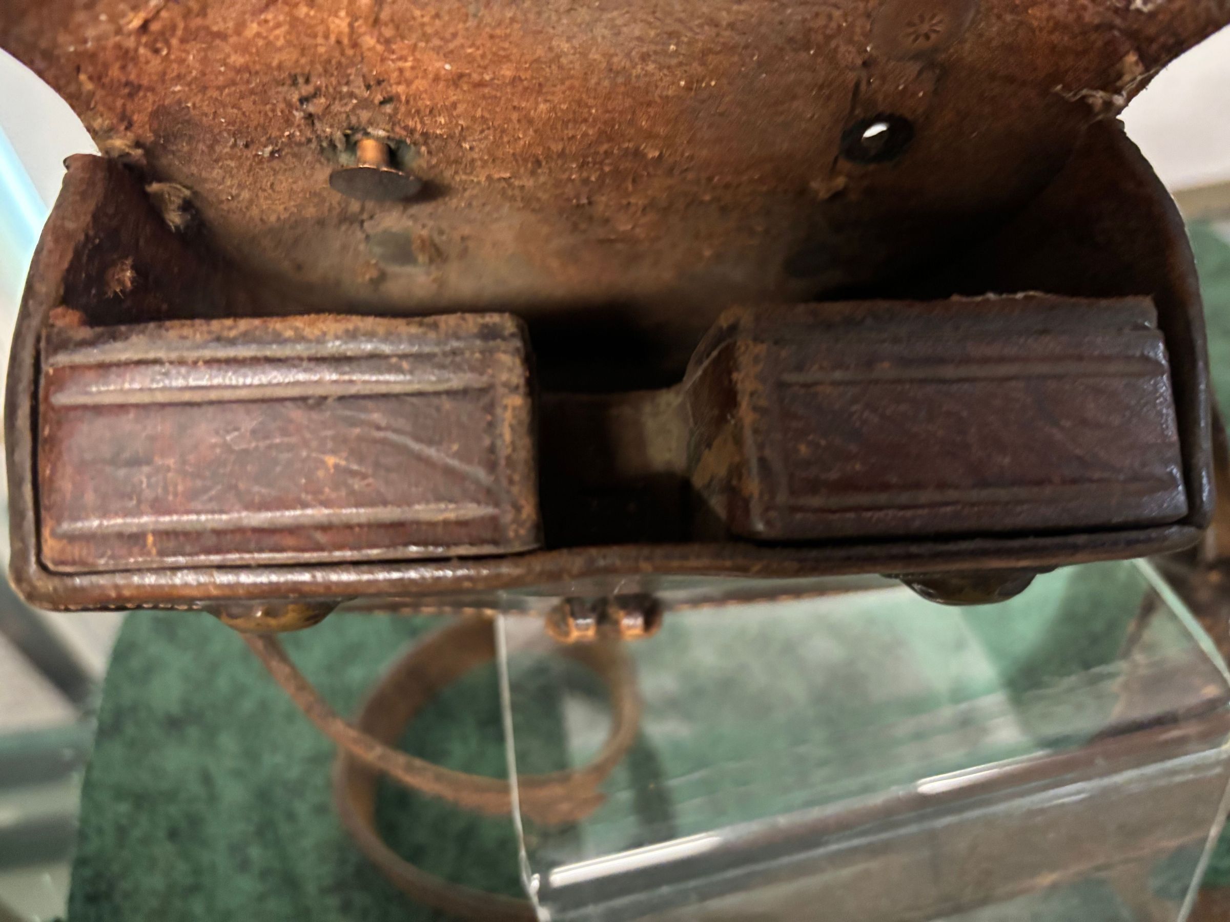 Leather case designed to hold a pocket surveyor's compass (.1). It is embossed with an "H", presumably for Henry, with two leaves at the upper left and right and a tear drop below. It has a leather strap attached by rivets with a buckle for adjustment.