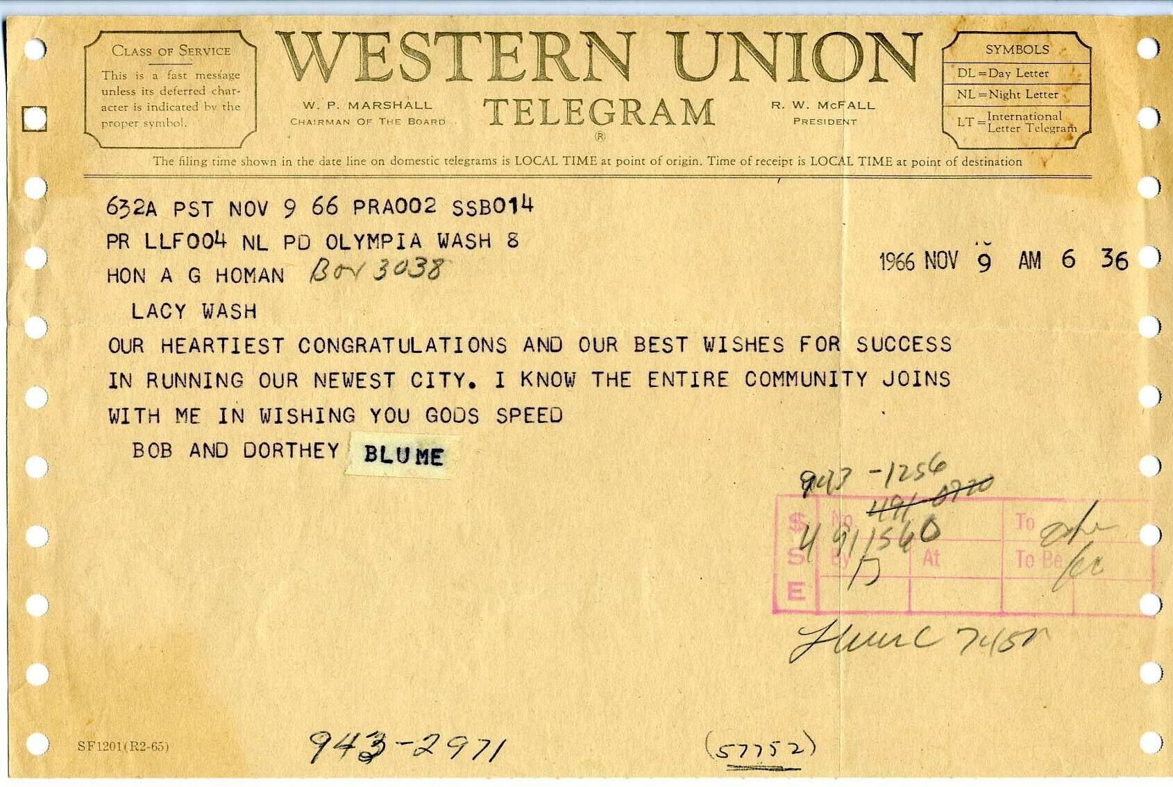 Bob and Dorothy Blume wish newly-elected Mayor A. G. Homann their heartiest congratulations in running the newly-incorporated city of Lacey.Archive Details