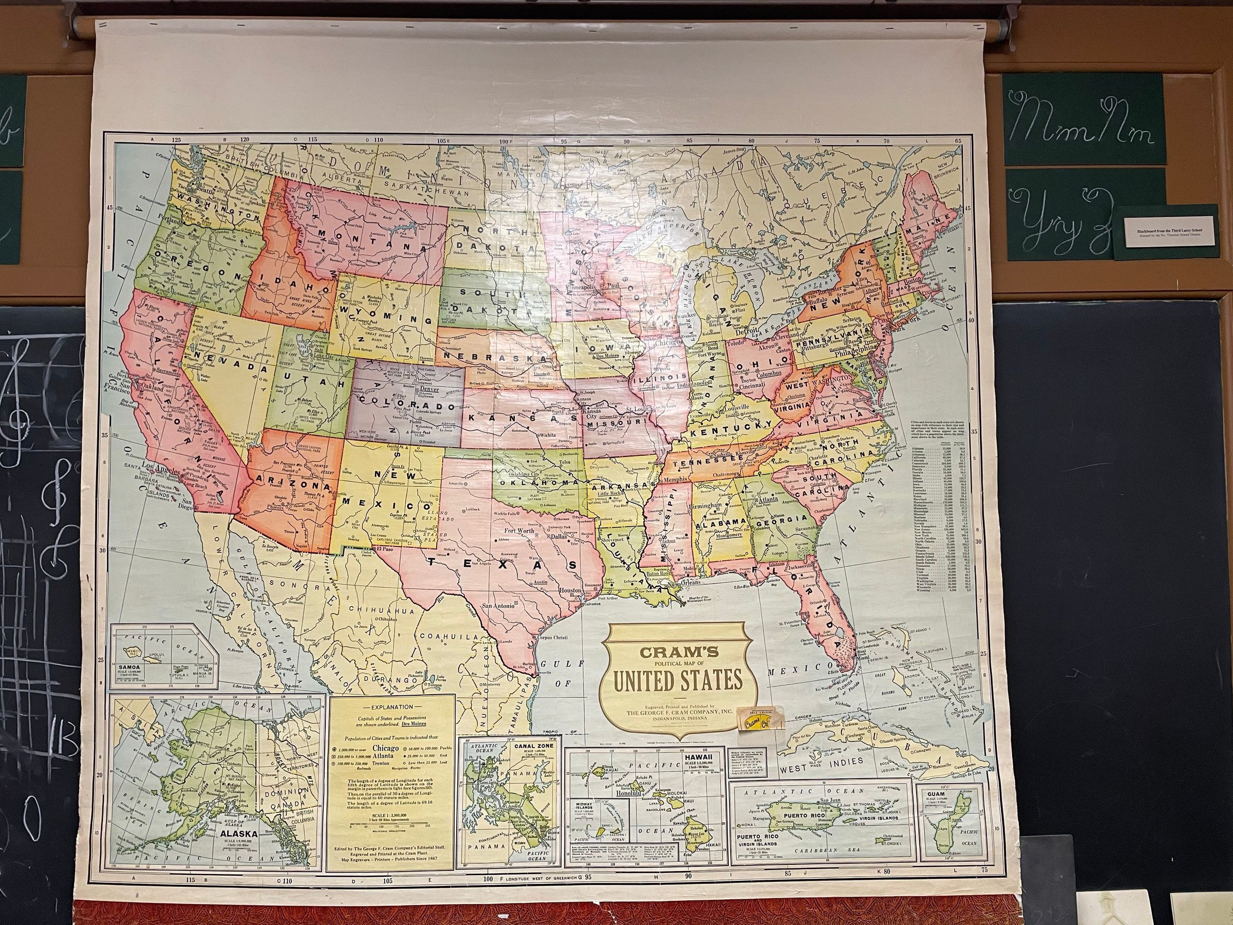 Roll-up map of the United States from the old Lacey School on Carpenter and Pacific.