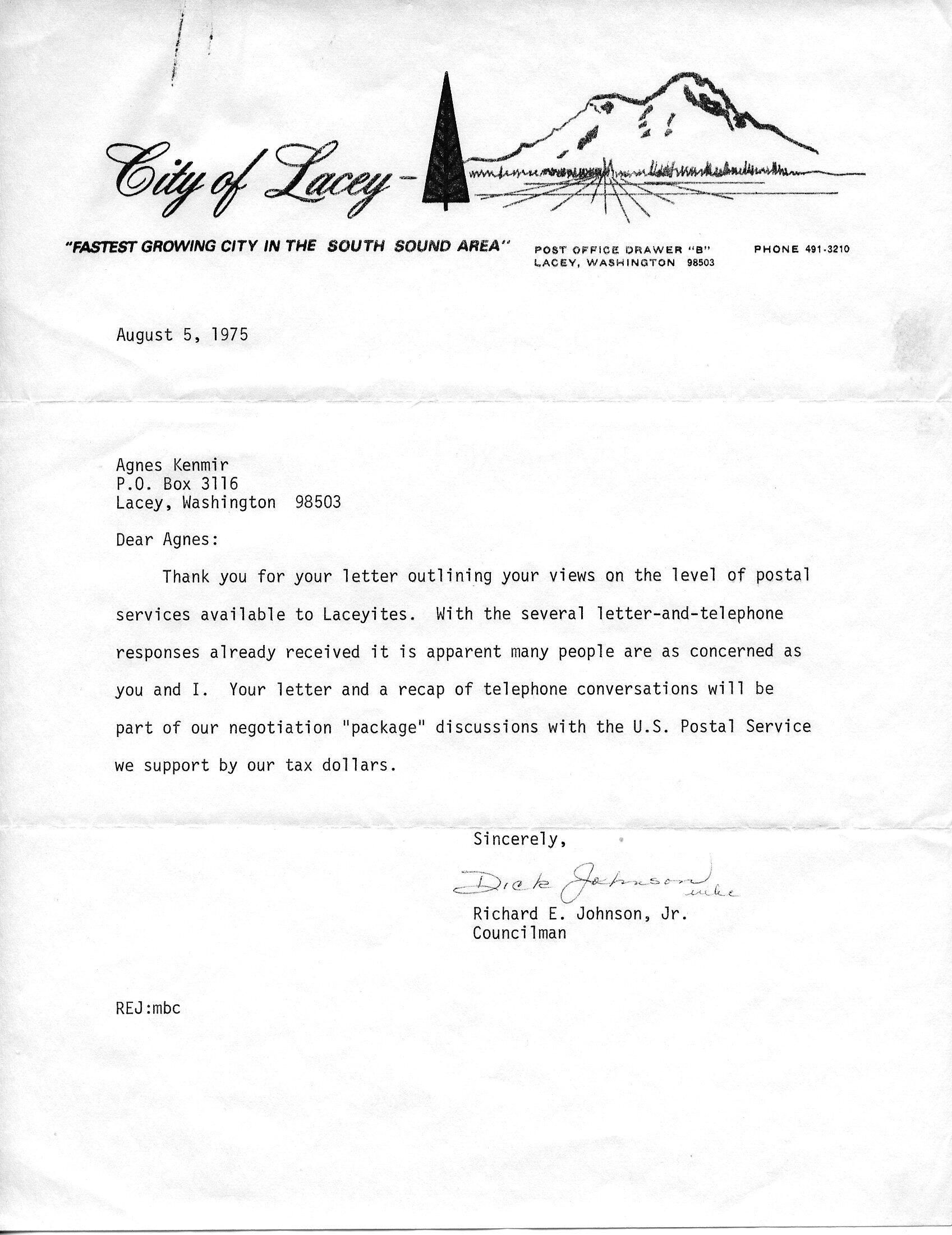 *Letter to Kenmir from Lacey City Councilmember Richard E. Johnson, August 5, 1975, regarding the postal service in Lacey.