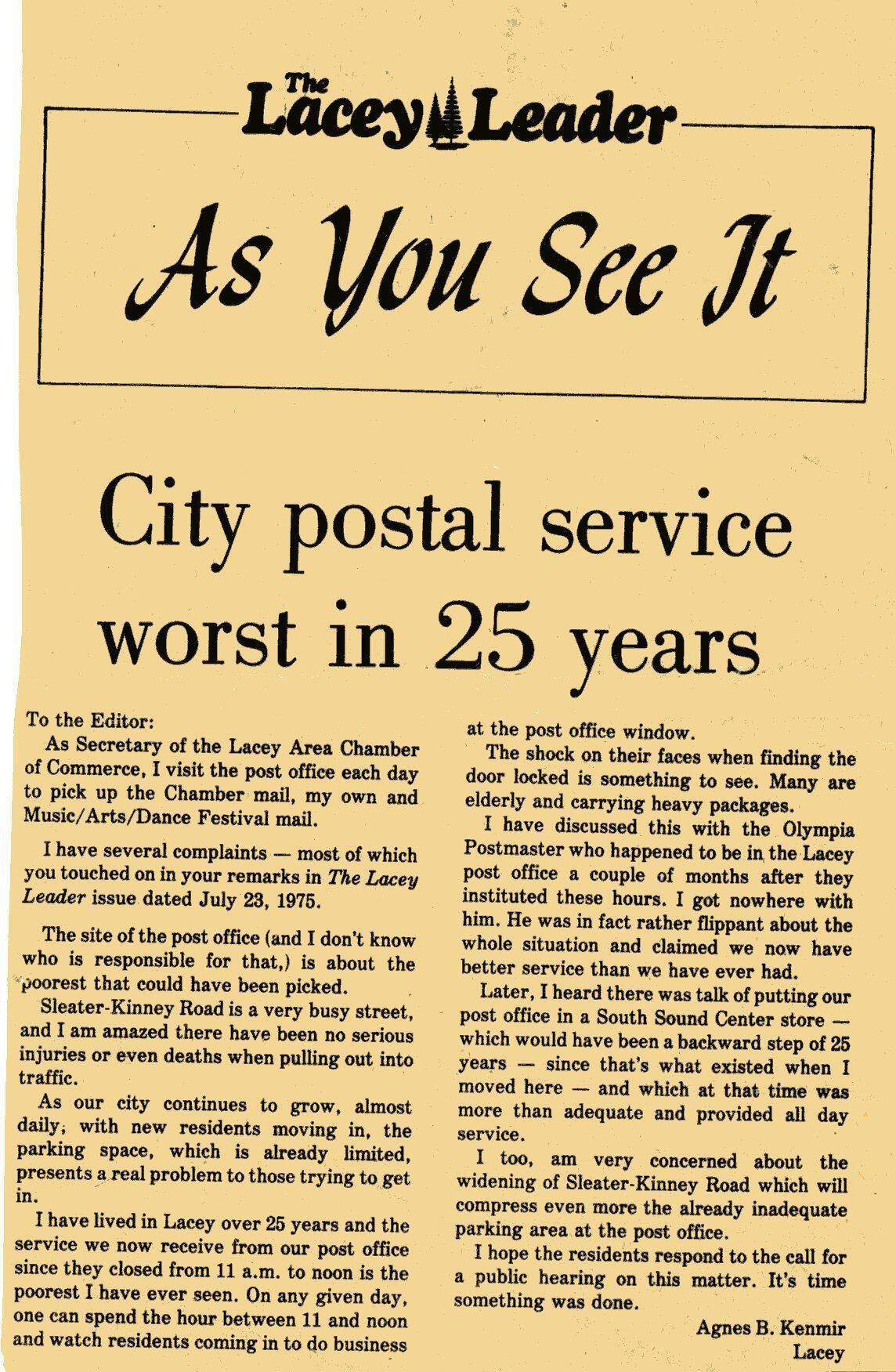 *Letter to the editor by Kenmir, Lacey Leader, "City postal service worst in 25 years, c. July 1975