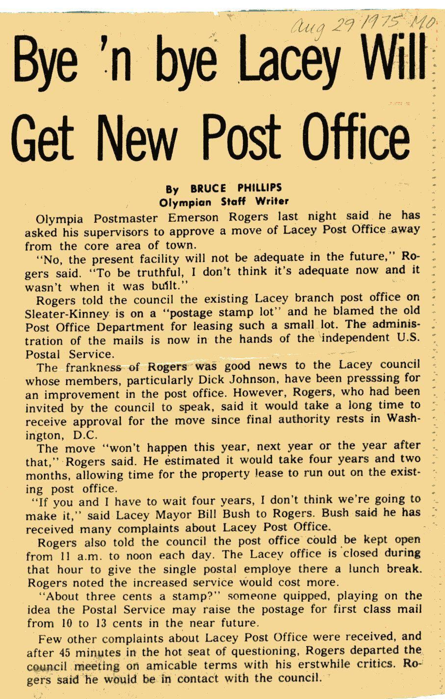 *Newspaper clipping, "Bye 'n bye Lacey Will Get New Post Office," The Olympian, August 29, 1975.