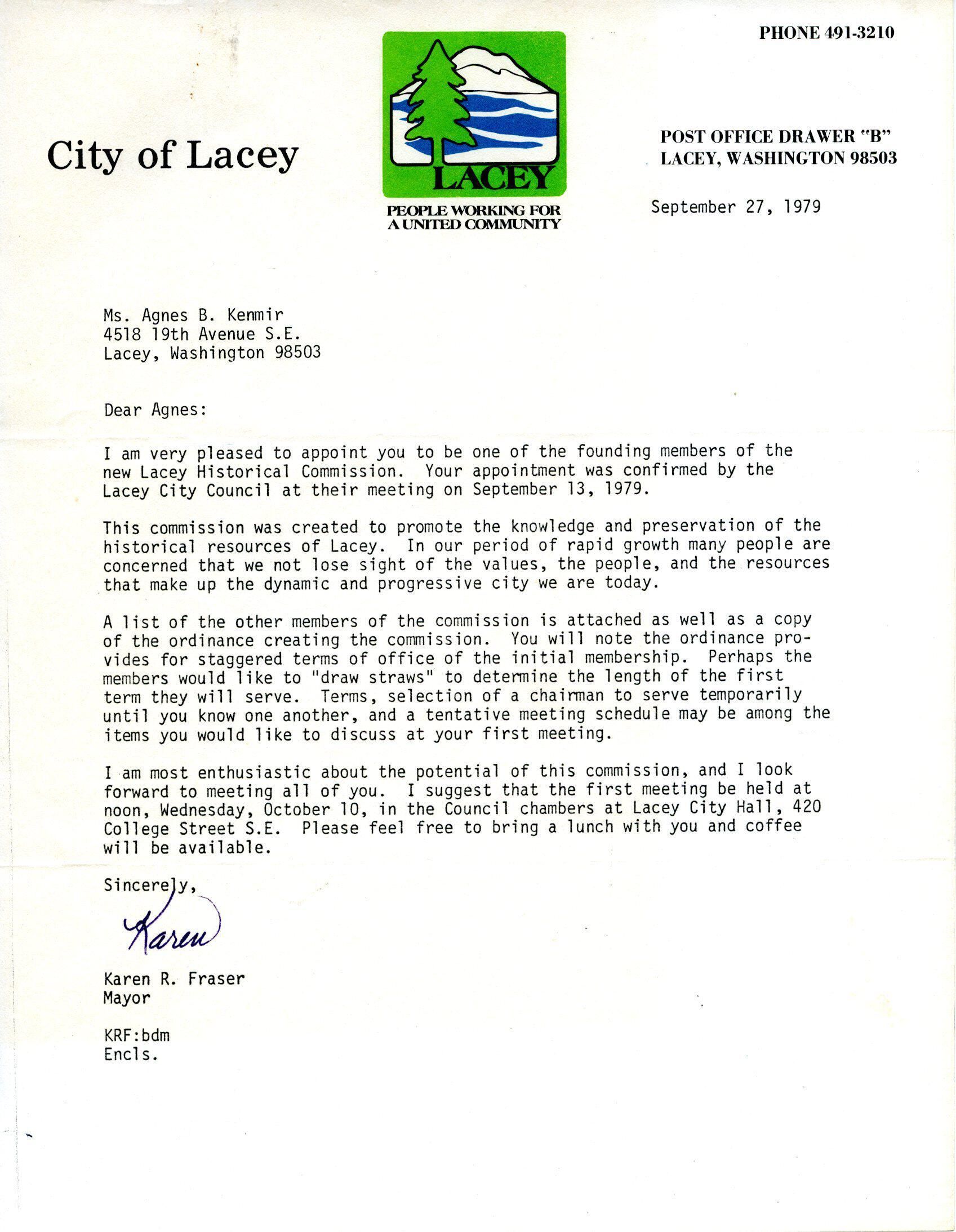 *Letter to Kenmir from Lacey Mayor Karen Fraser, September 27, 1979, appointing her as a founding member of the newly formed Lacey Historical Commission.