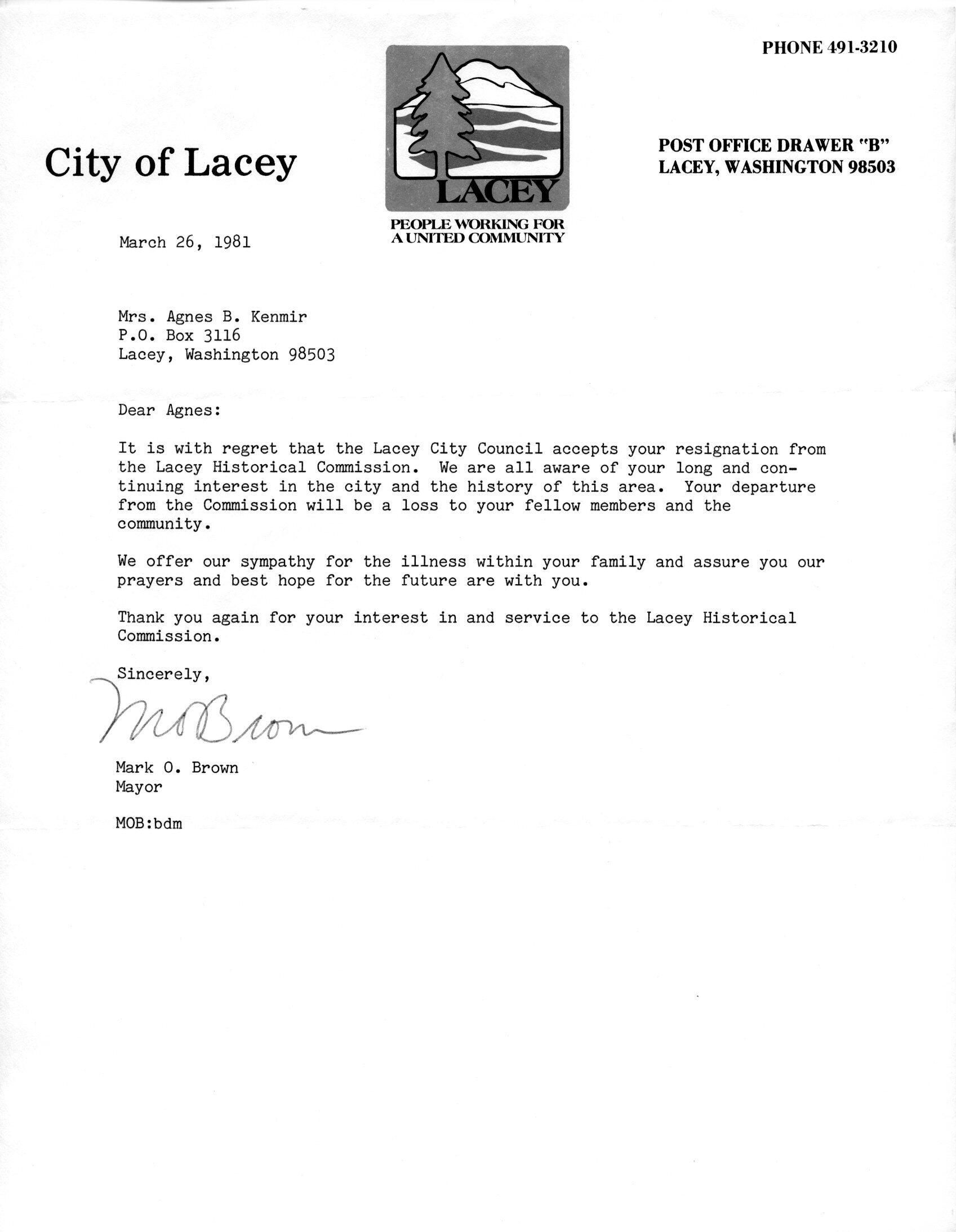 *Letter to Kenmir from Lacey Mayor Mark O. Brown, March 26, 1981 accepting her resignation from the Lacey Historical Commission.