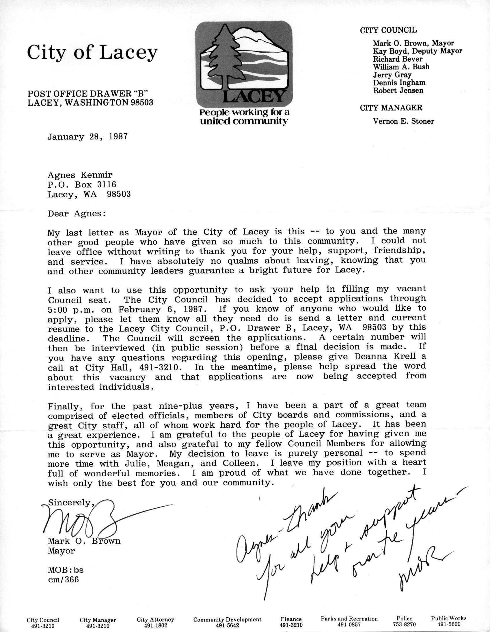 *Letter to Kenmir from Lacey Mayor Mark O. Brown, January 28, 1987, requesting her assistance in finding potential candidates to fill his upcoming vacany on the Council.