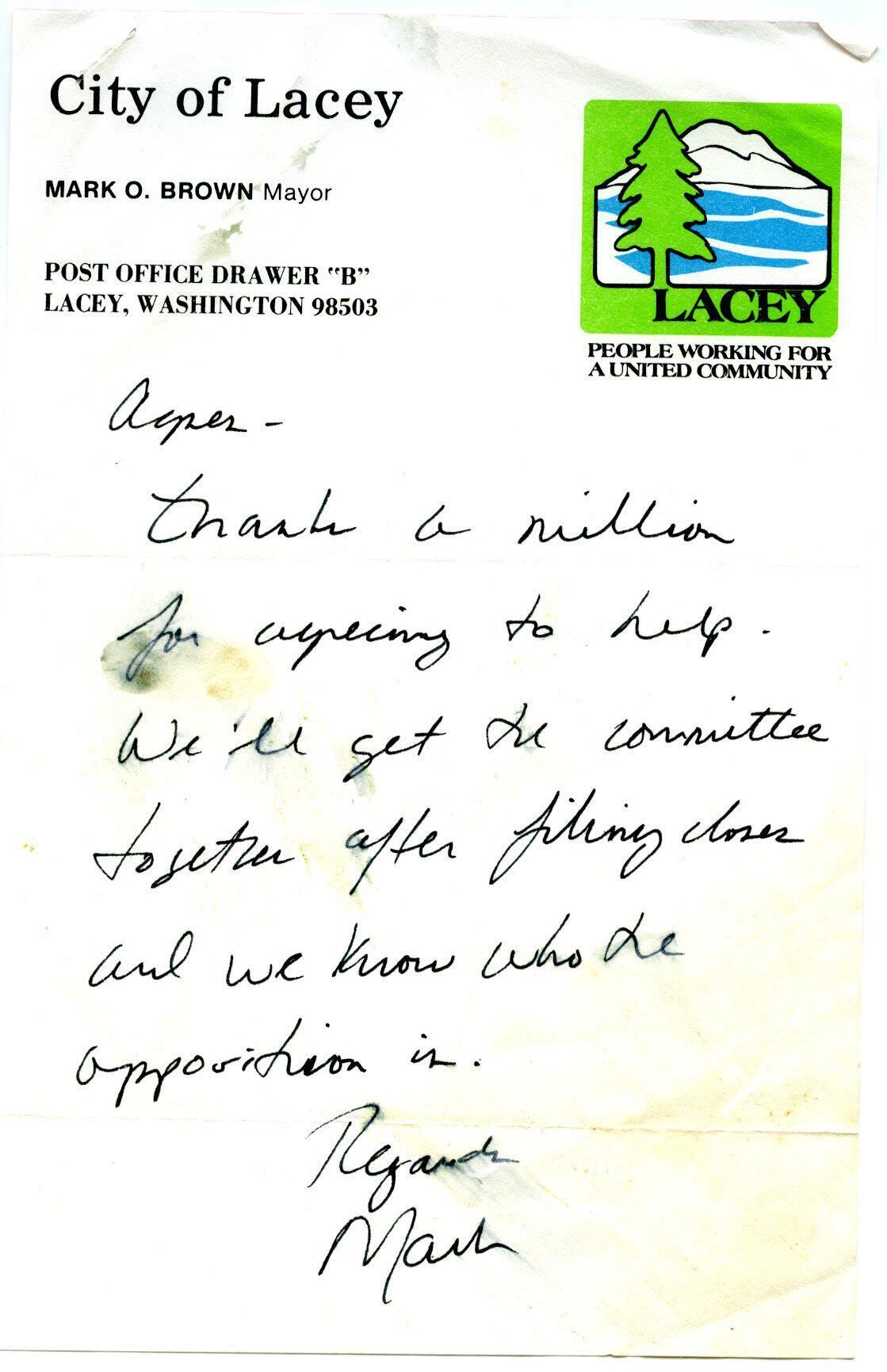 *Handwritten note to Kenmir from Lacey Mayor Mark O. Brown, thanking her for helping (presumably with finding candidates to fill his seat), c. Feb 1987.Lexicon