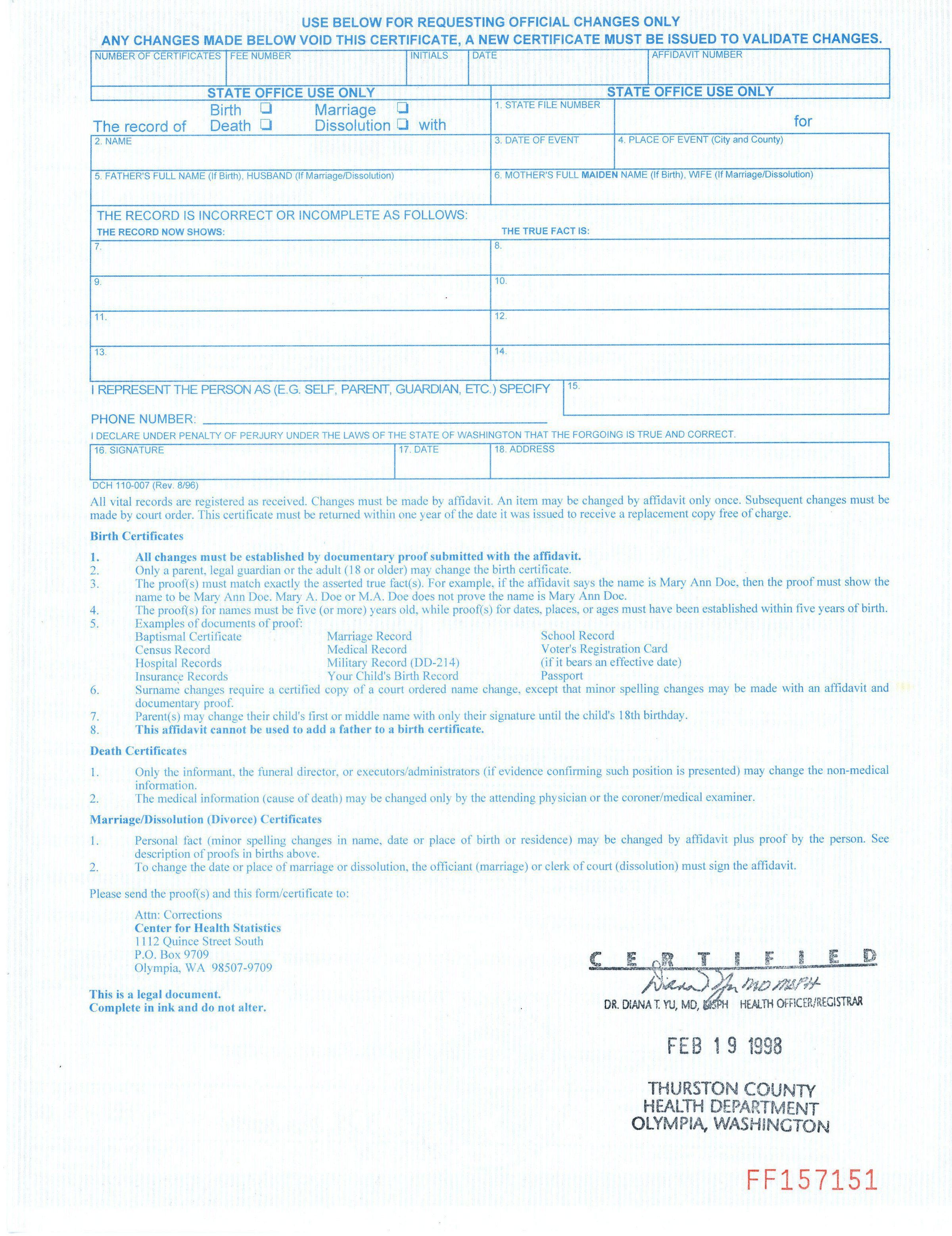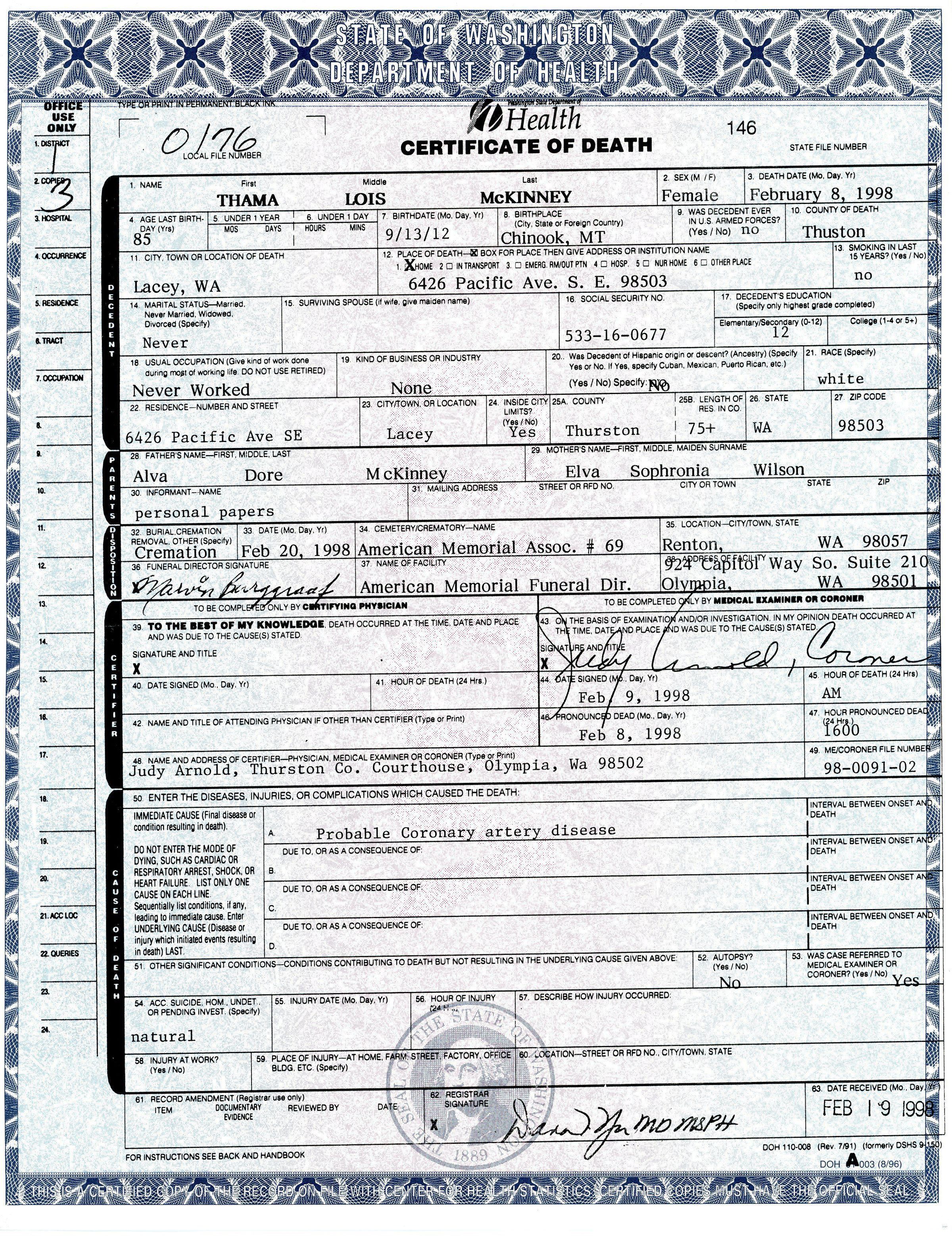 *Certificate of Death for Thama Lois McKinney (certified)