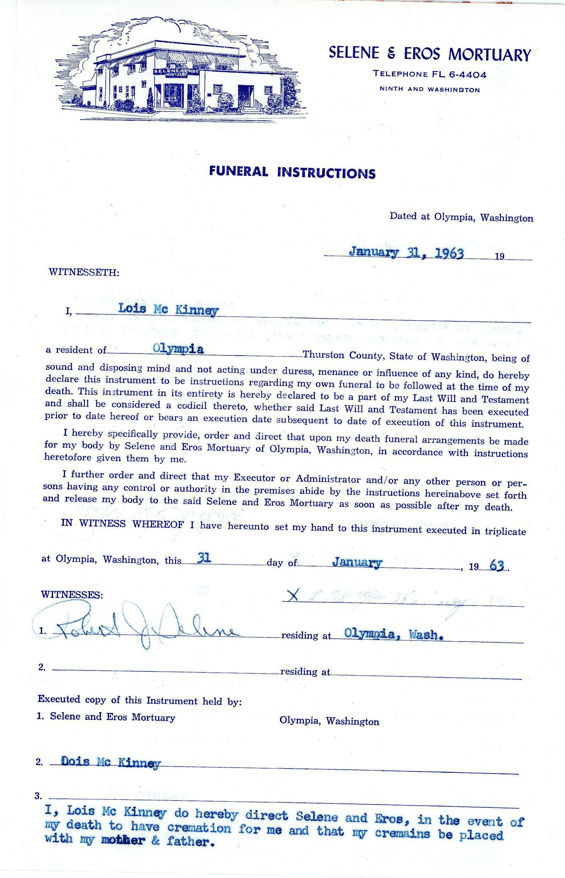 *Funeral instructions for Lois McKinney on Selene & Eros Mortuary letterhead.