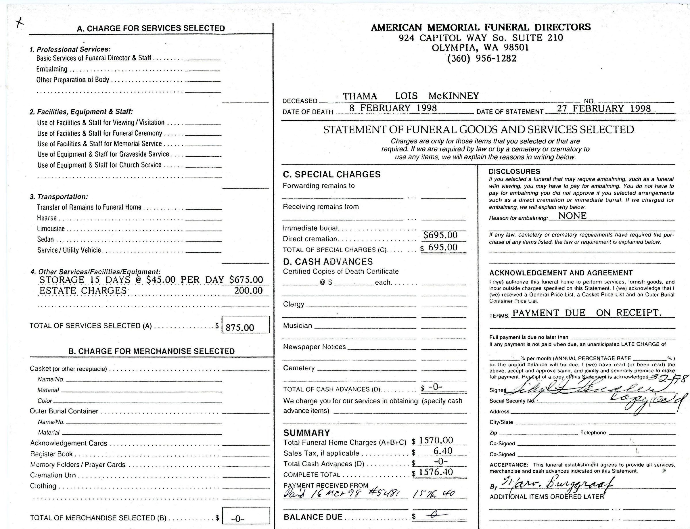 *Statement of Funeral Goods and Services Selected form for Thama Lois McKinney, American Memorial Funeral Directors