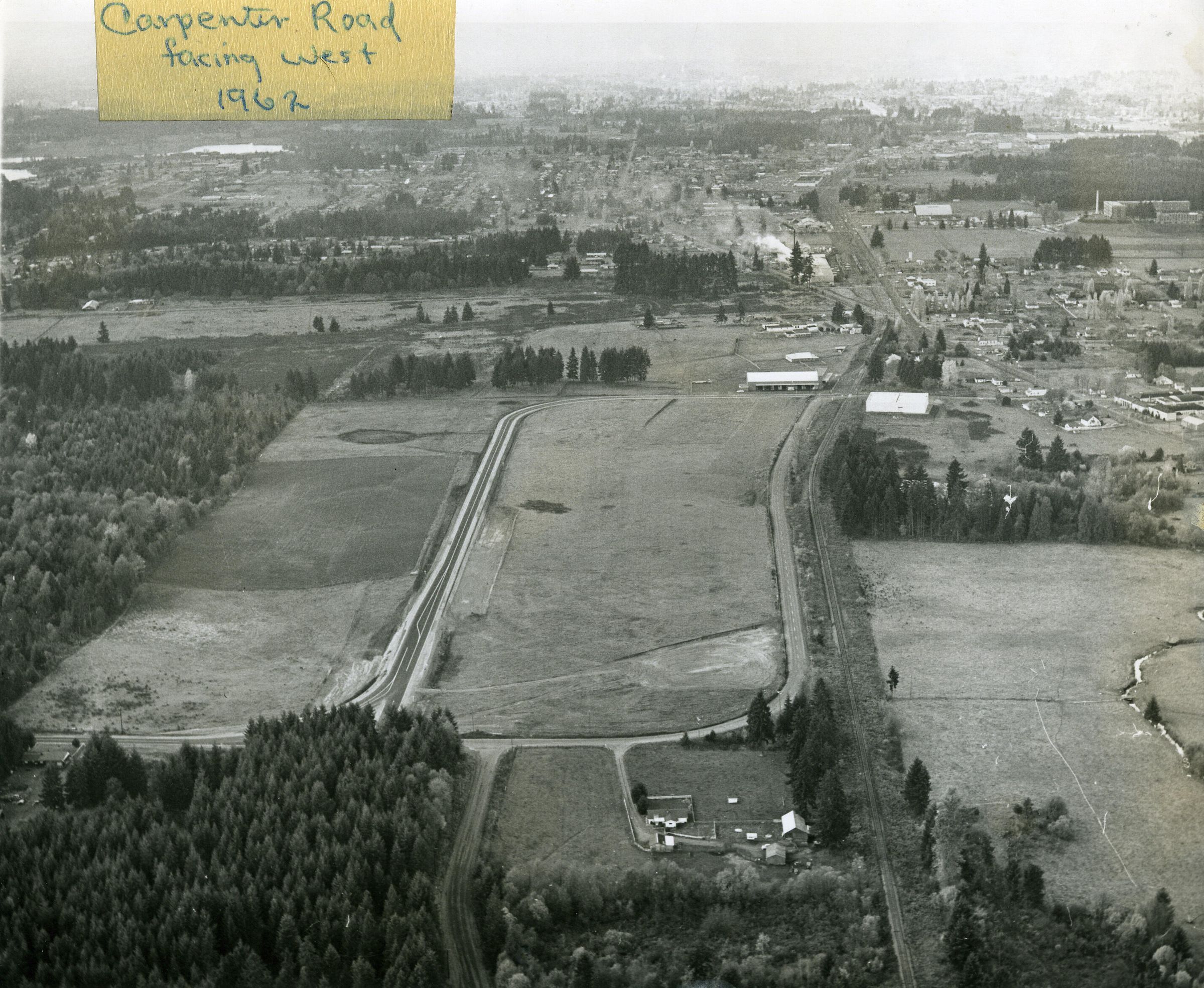 Black and white aerial photograph (scanned copy) of Carpenter Road, looking west over Lacey. As of 2021, the is where the North Thurston Public School Bus Barn is located. The railroad runs north-south through this image. The Lacey "wedge" can be seen near the top with the South Sound Shopping Center in the upper right. Saint Martin's College (now University) is off Pacific to the right (north).Made/Created