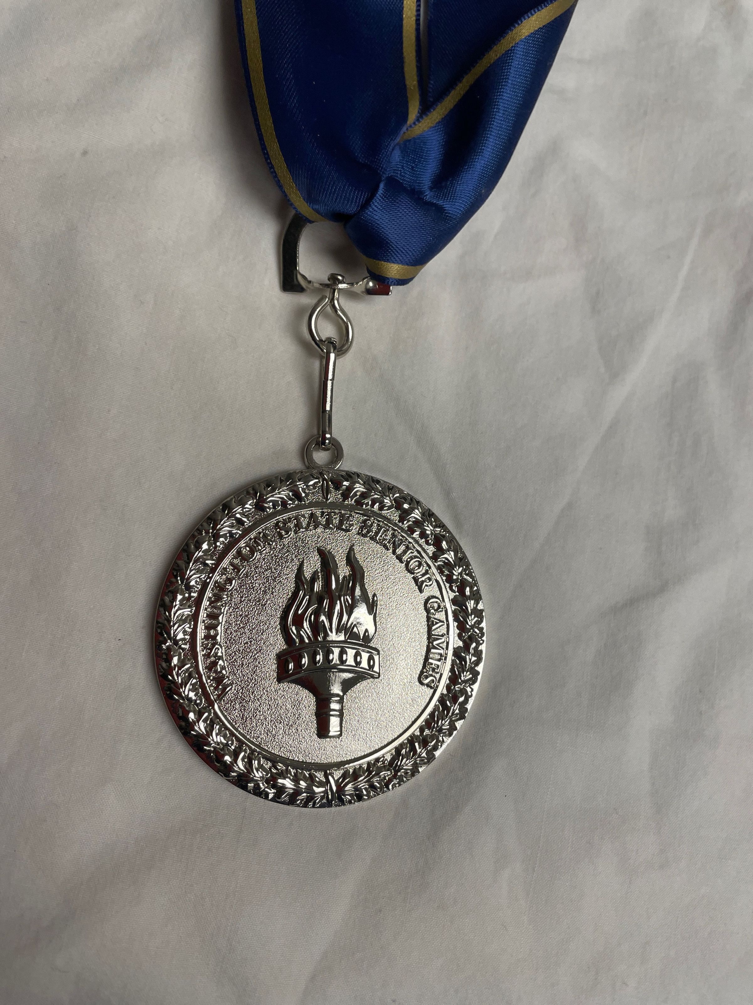 2018 Washington Senior Games (WSSG) medal. Silver-colored metal disk has raised letters that read: "WASHINGTON STATE SENIOR GAMES" and a torch. It is attached to a ribbon so that the competitor could wear it over their neck. The ribbon is blue with gold trim and gold lettering: "Washington State Senior Games 2018." On the back there is a note taped on it: "Shotput 18.45 ft."