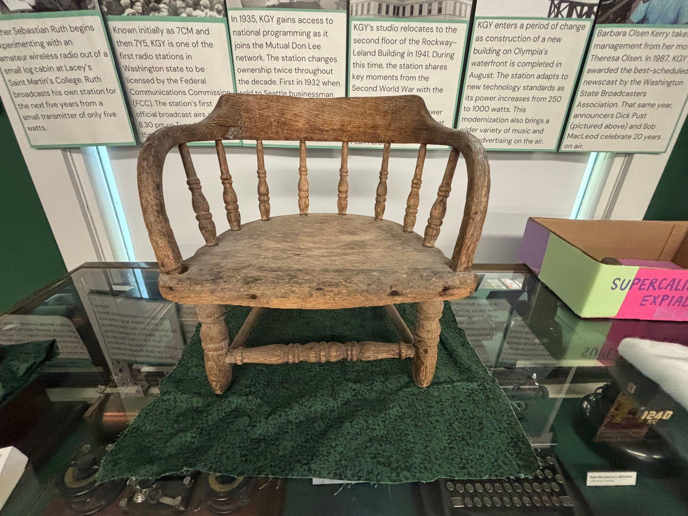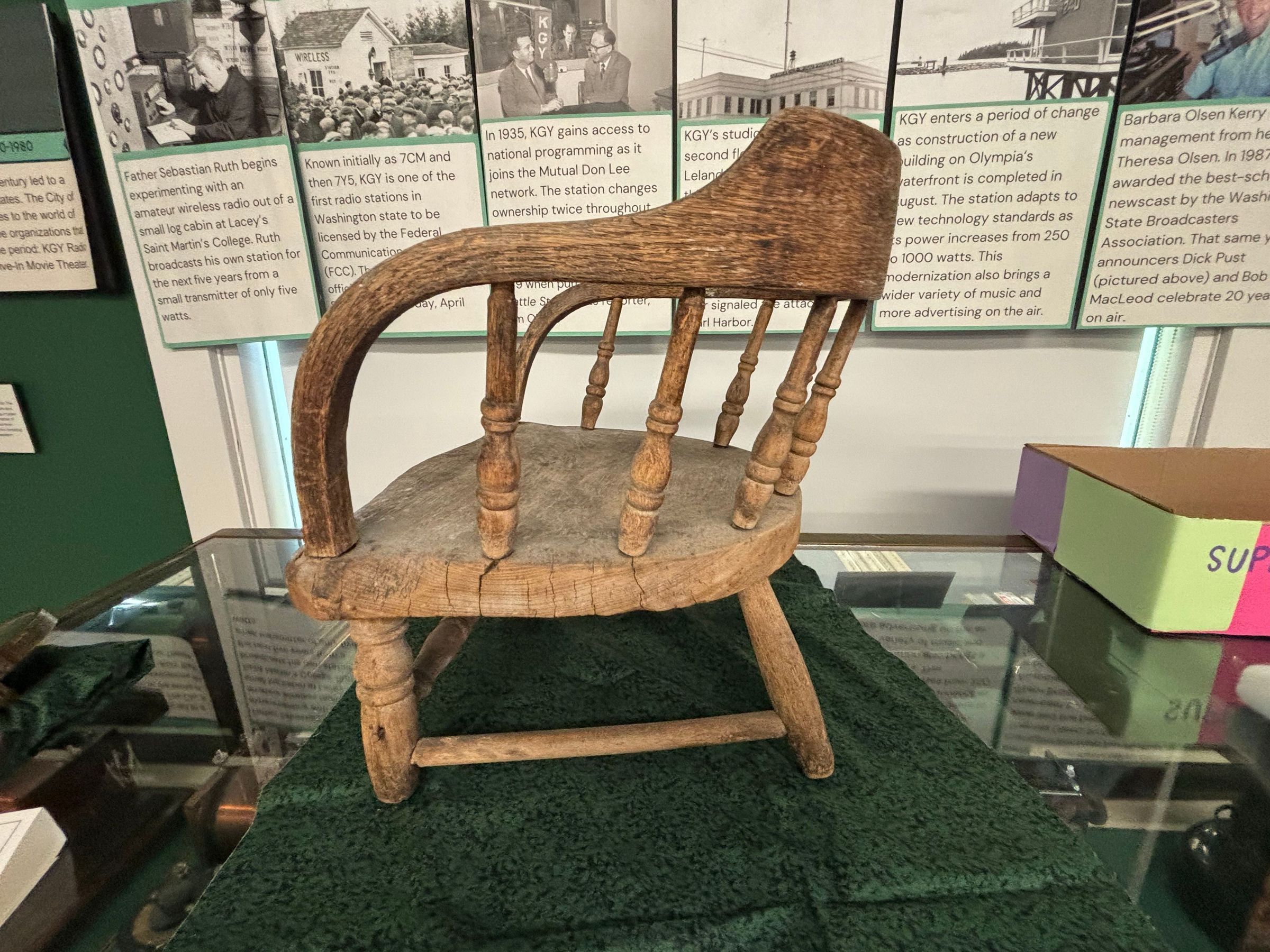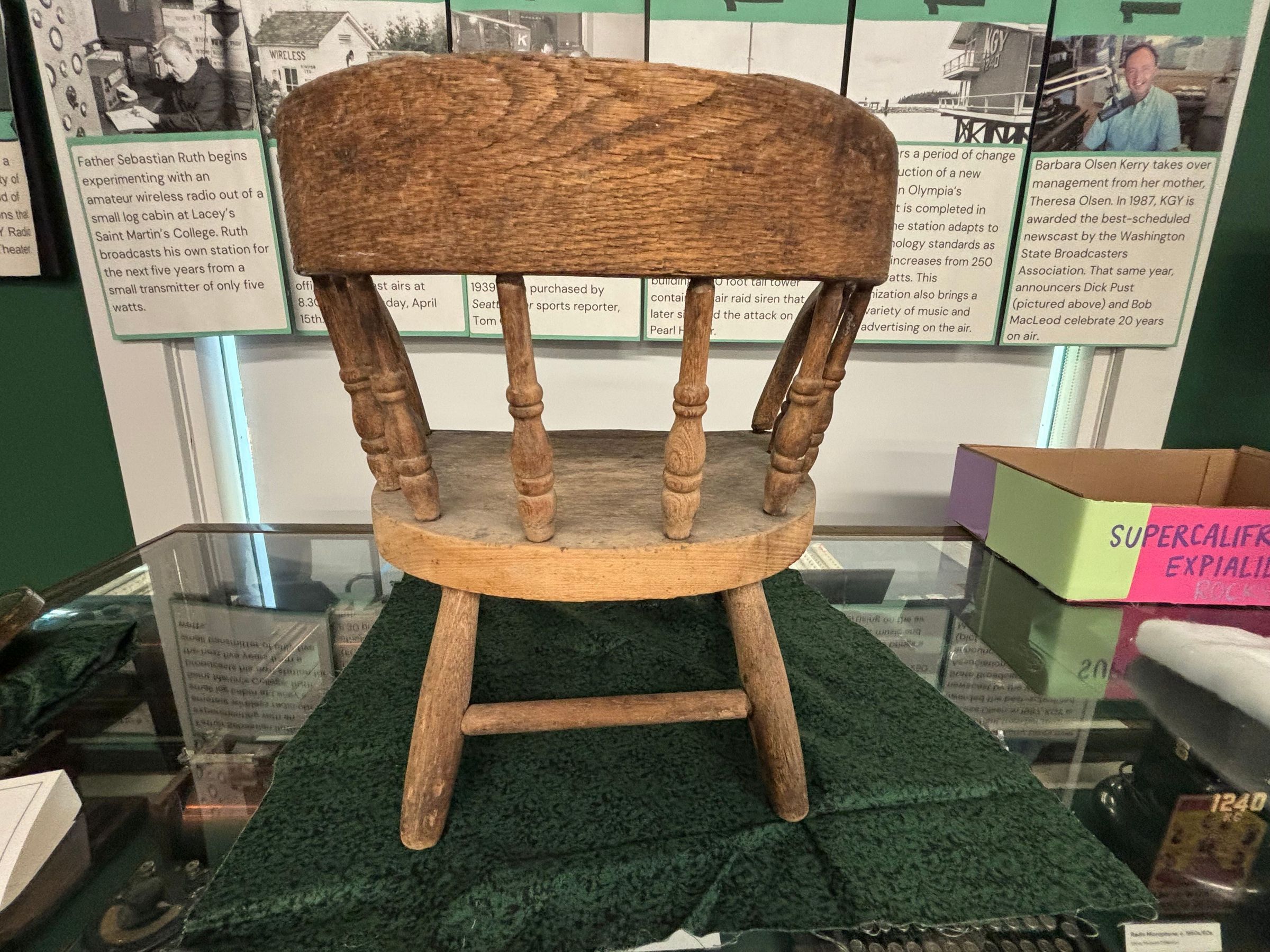 Oak child's chair has a curved top rail extending down into curved armrests. Eight spindles create the back and side rest. Each leg is connected with a side stretcher; the one in front is decoratively turned.Made/Created