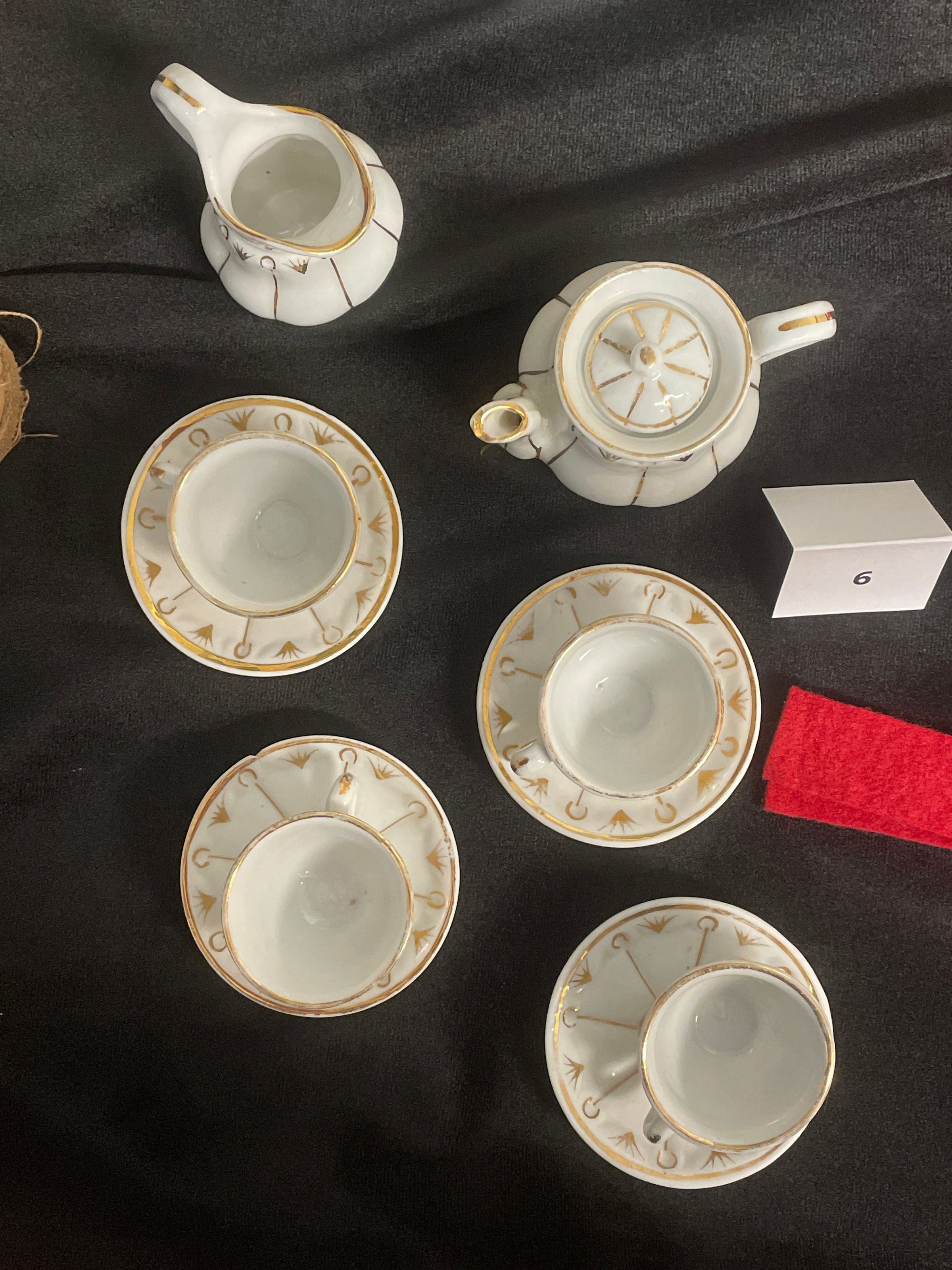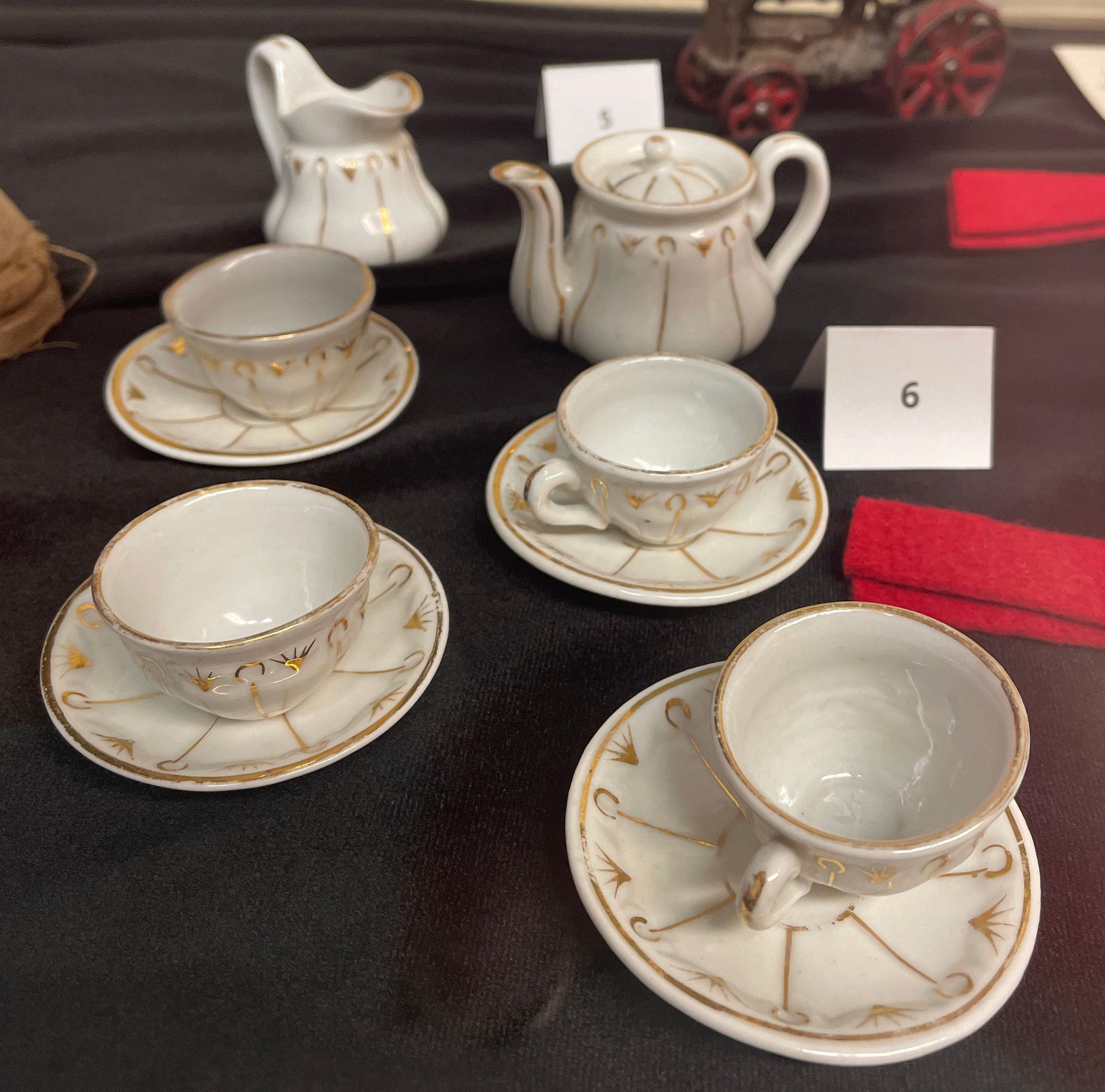 Child's tea set, white ceramic with gold geometric pattern. Associated note reads: Dec. 31, 1939. These dishes belong to your grandmother Nancy Ella Parsons Fleetwood and she had them when she was a little girl. They are over 70 years old."