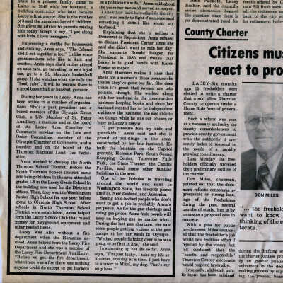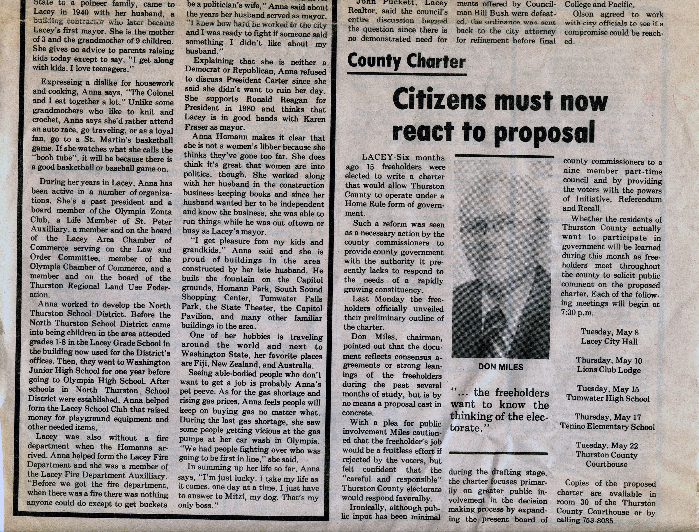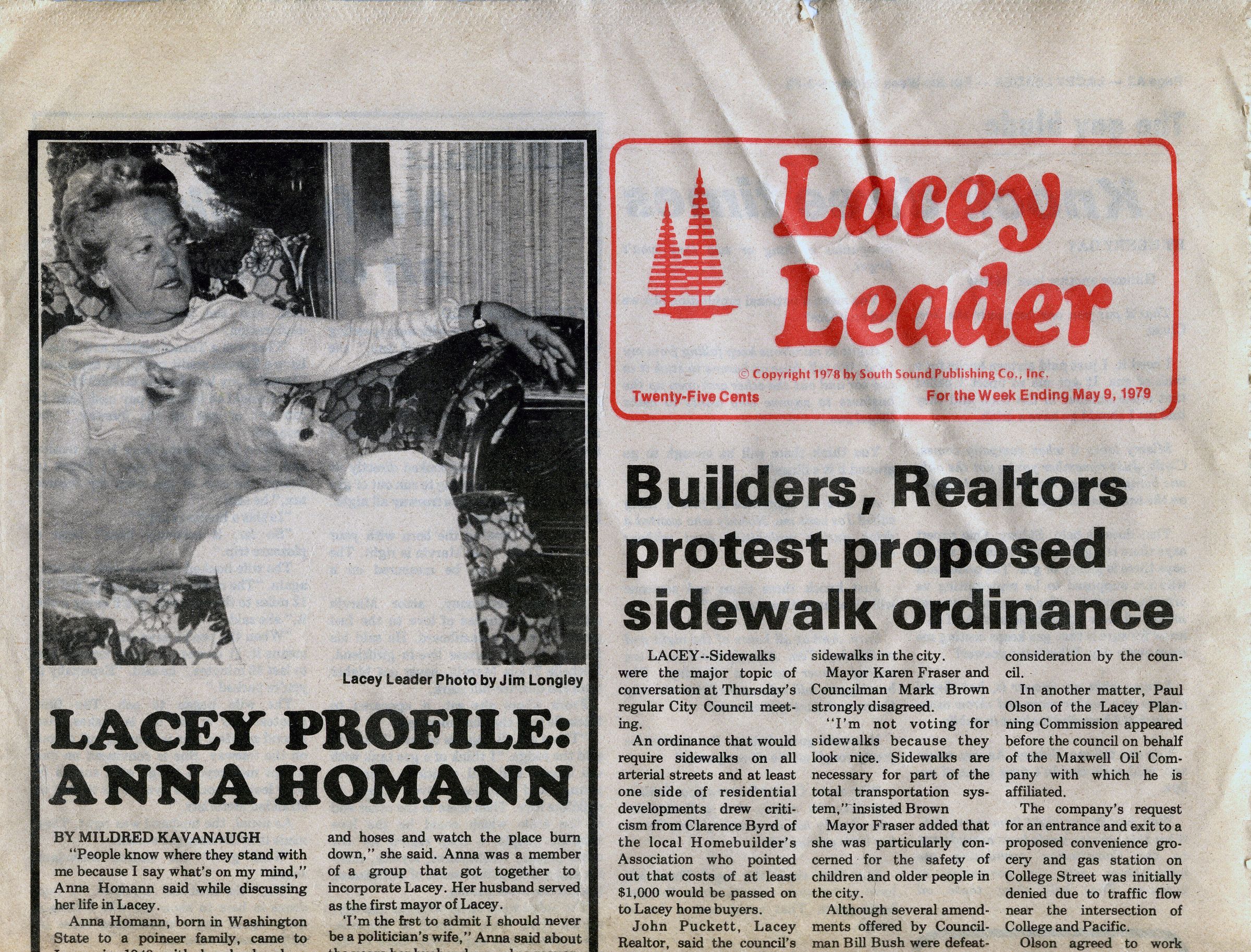 Front page of the Lacey Leader newspaper (scanned copy, 2 images) from May 9, 1979. There are three headlines: "Builders, Realtors protest proposed sidewalk ordinance" (to add a requirement for sidewalks on arterial streets), "County Charter: Citizens Must Now React to Proposal," (to change county government to Home Rule Charter), and "Lacey Profile: Anna Homann" which is about the wife of Lacey's first mayor, Al Homann.