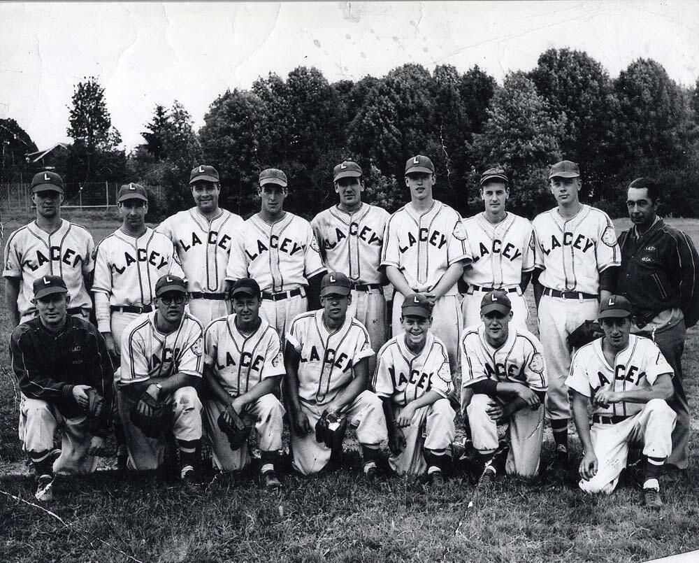 Black and white photograph (scanned copy) of the Lacey Lions Baseball Team, date unknown, but possibly c. 1950s. Al Homann is at the far right in the back row. He is possibly a coach or team manager.Made/Created