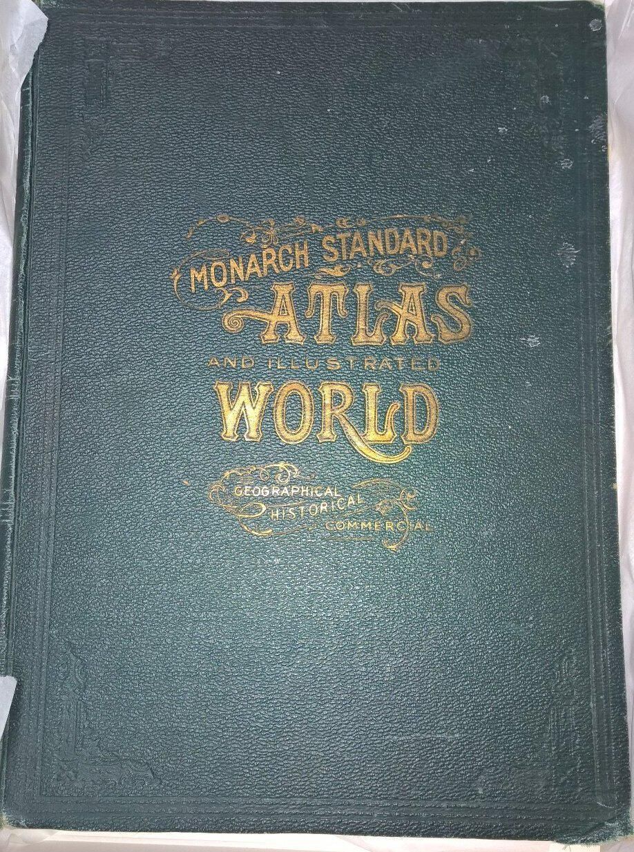 Green, hard cover. In the center of the front cover the title "The Monarch Standard Atlas and Illustrated World: Geographical Historical and Commercial" is impressed with gold letters. Woven around the title is some scrollwork also in gold. The front cover has an impressed border of three lines with impressed scrollwork in the corners. The spine has the title "Monarch Stadard Atlas of the World" above the author's name Martin Miller stamped in a bronze color. The Back cover has no decoration. There is some discoloration on the covers from scratches and general use.