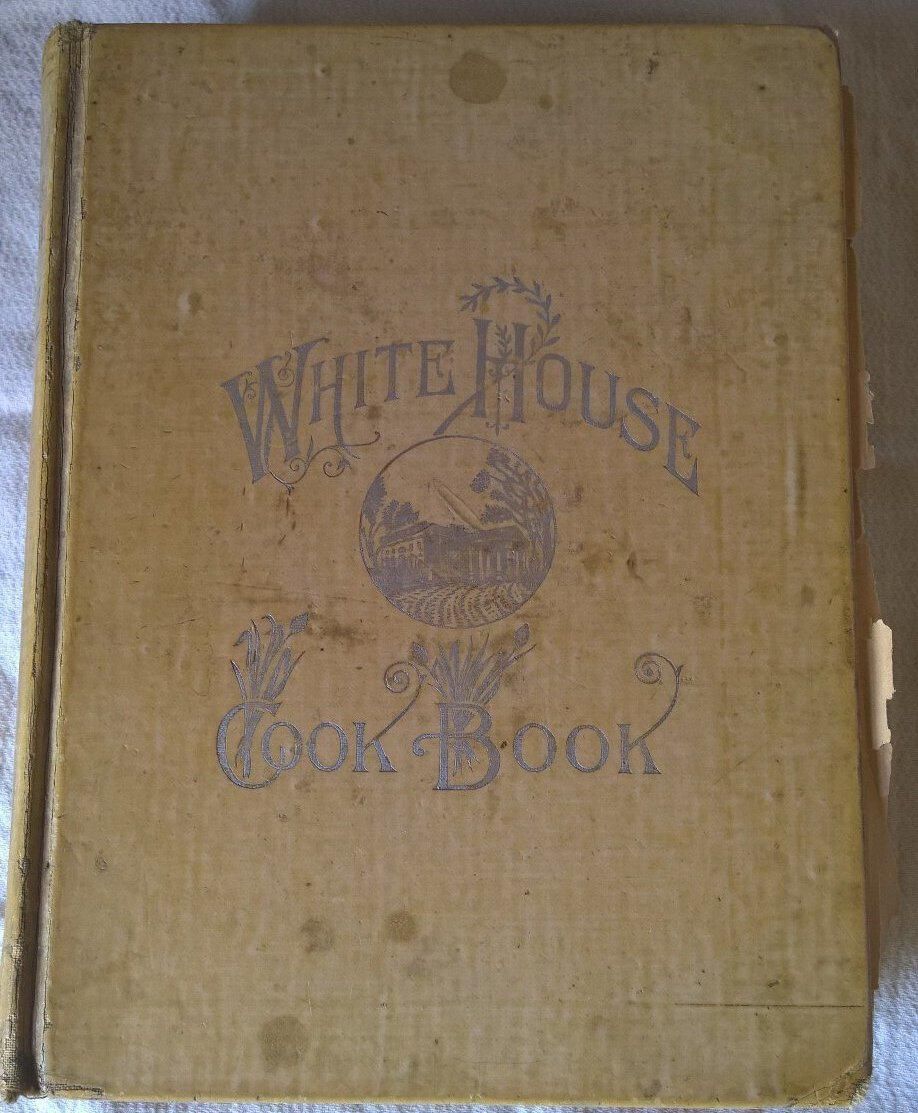10" x 7.5" x 2". A faded yellow cover spotted with grease stains. The corners are dented and frayed. The front cover has the title "White House Cook Book" in gray ink with decorations of plants interwoven with the letters. There is a circular shaped picture of the White House in the middle of the title with "White House" above, and "Cook Book" below. The spine has the title in gray ink and the author name just below the title. The title and author name are bordered above and below by two lines on the same color ink. At the bottom of the spine is the word "Illustrated". There is no decoration of the back cover.Lexicon