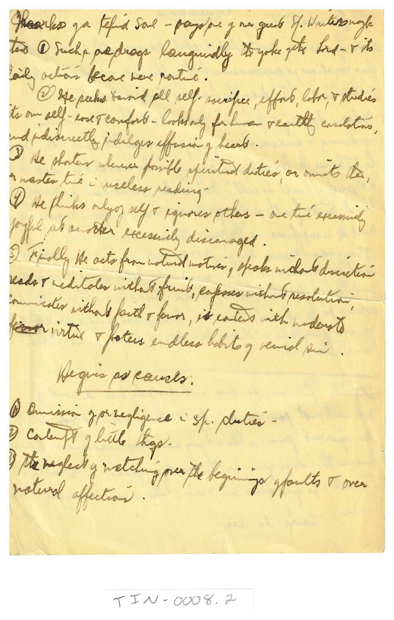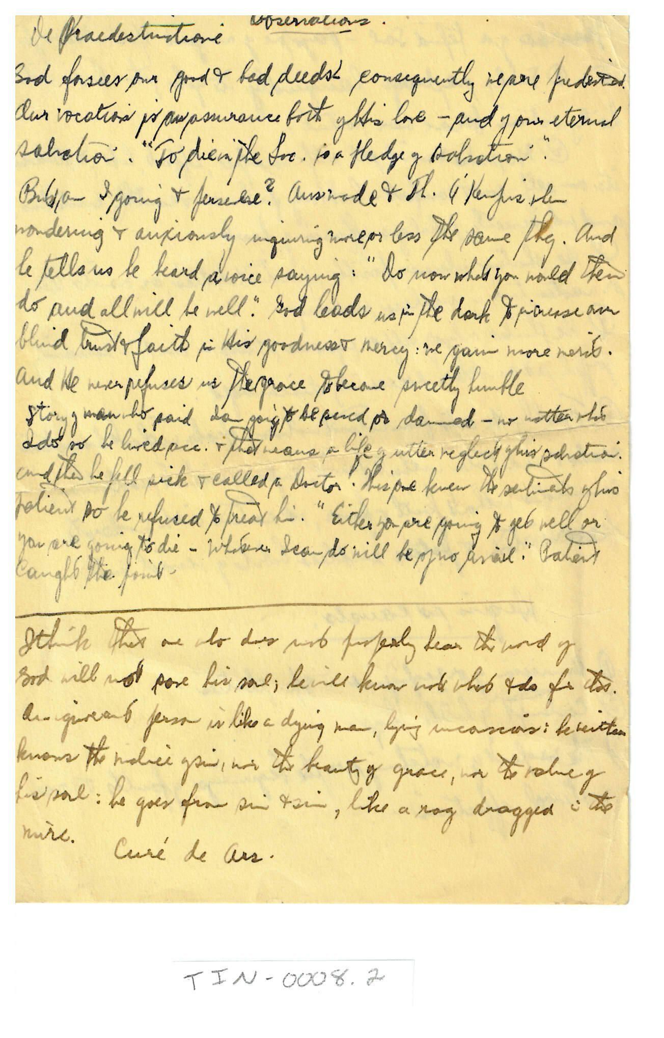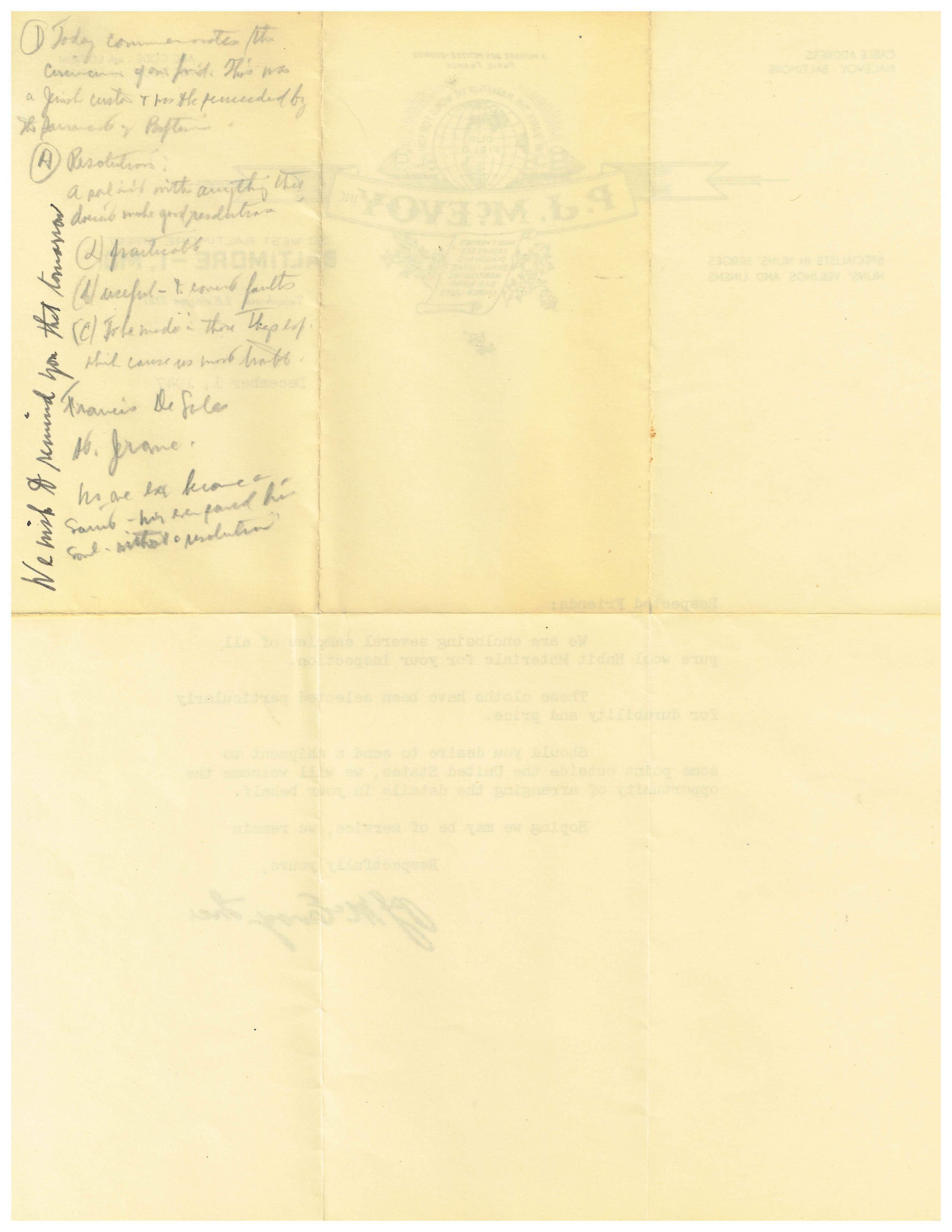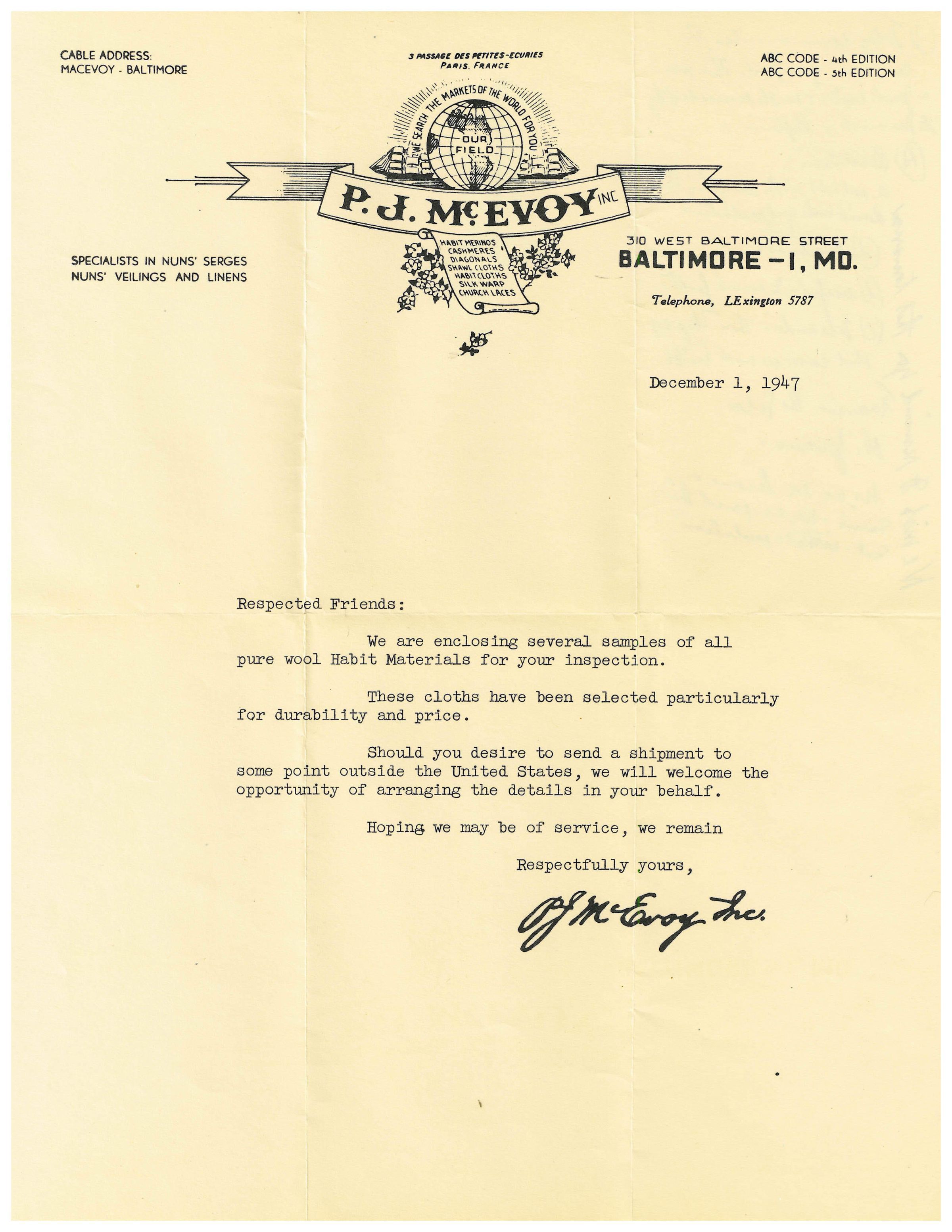 TIN-0008.2 appear to be notes, possibly titled "observations". TIN-0008.3 is a typed letter dated December 1, 1947 from P.J. McEvoy Inc. located in Baltimore. This company is supposed specialists in "nun's serges nun's veilings and linens".The letter describes the sending of sample Habit materials and a possible future shipment. On the back of the letter are handwritten notes in pencil and ink, possibly talking points.