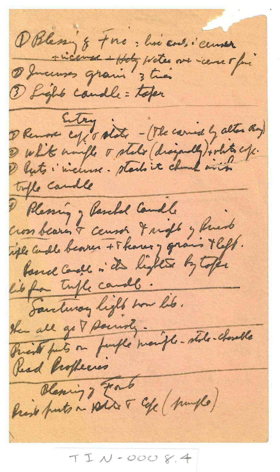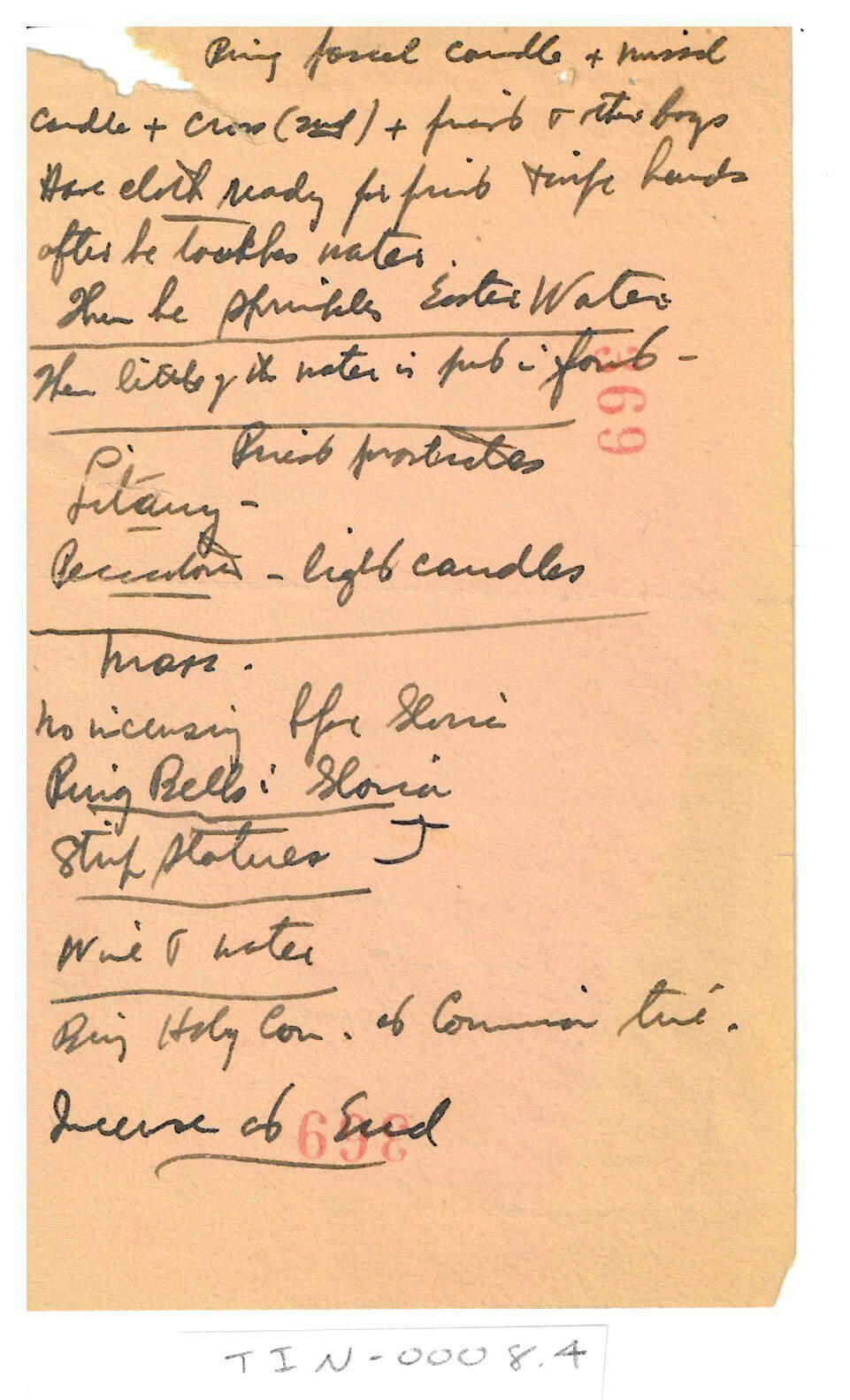 Found inside the missal were two pages of notes and a letter. The first note, TIN-0008.2, and the letter, TIN-0008.3, were found between pages 128 and 129. The second note, TIN-0008.3, was found between pages 180 and 181.