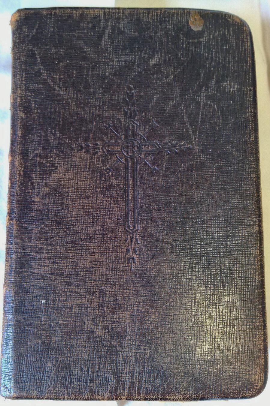 TIN-0008.1 is a liturgical book outlining instructions and prayers for Catholic mass throughout the year. This missal is in traditional Latin. It includes a frontispieces and On the page opposite the front cover is a name inscribed in pencil. Due to the pattern on the page the name is obscured and we cannot make out the full name.