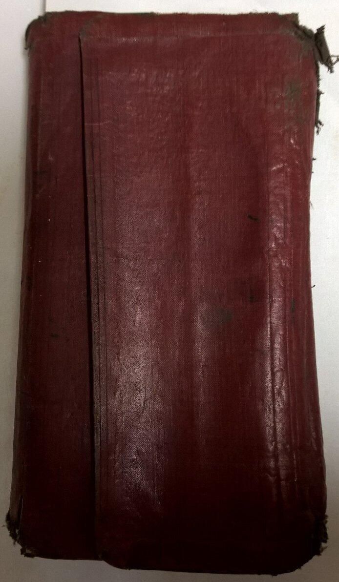 6.5" x 4" x 1". Bound in red leather with a flap that folder over the front.Lexicon